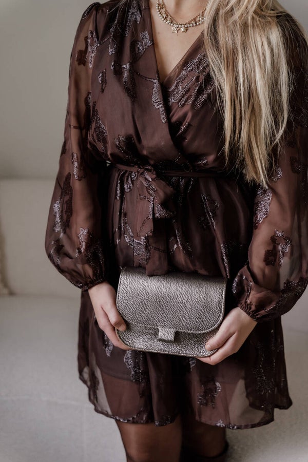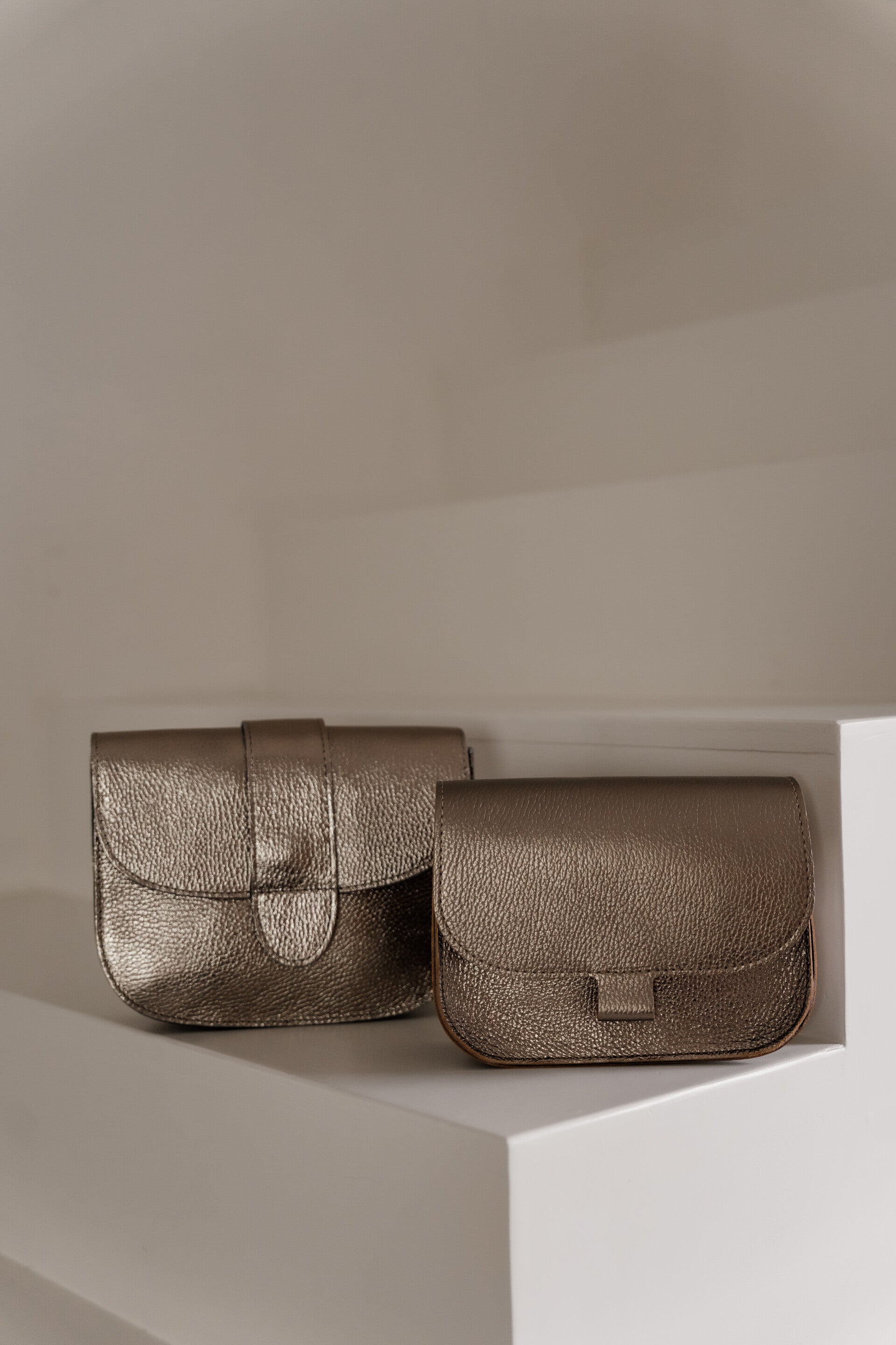 Tas Flora is een Suede leren crossbodytas met een magneetsluiting en een lang verstelbaar hengsel.