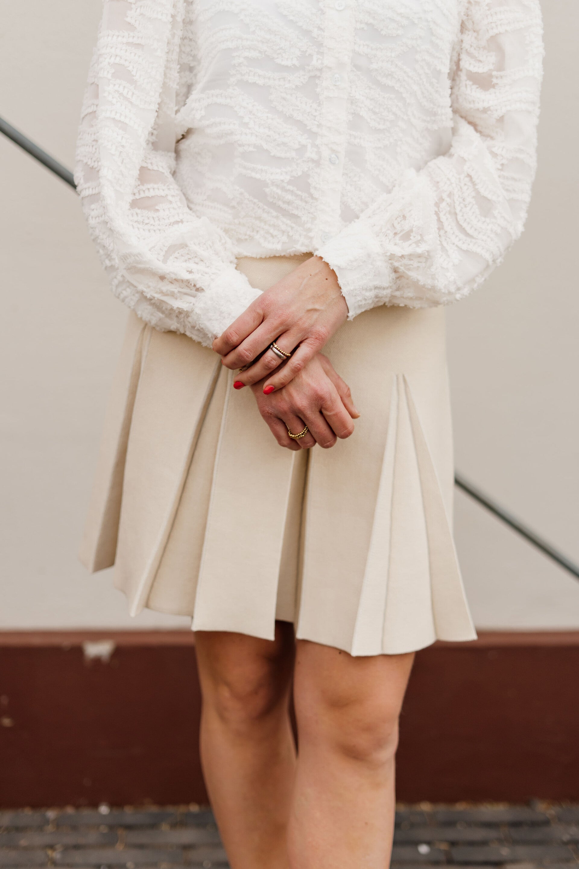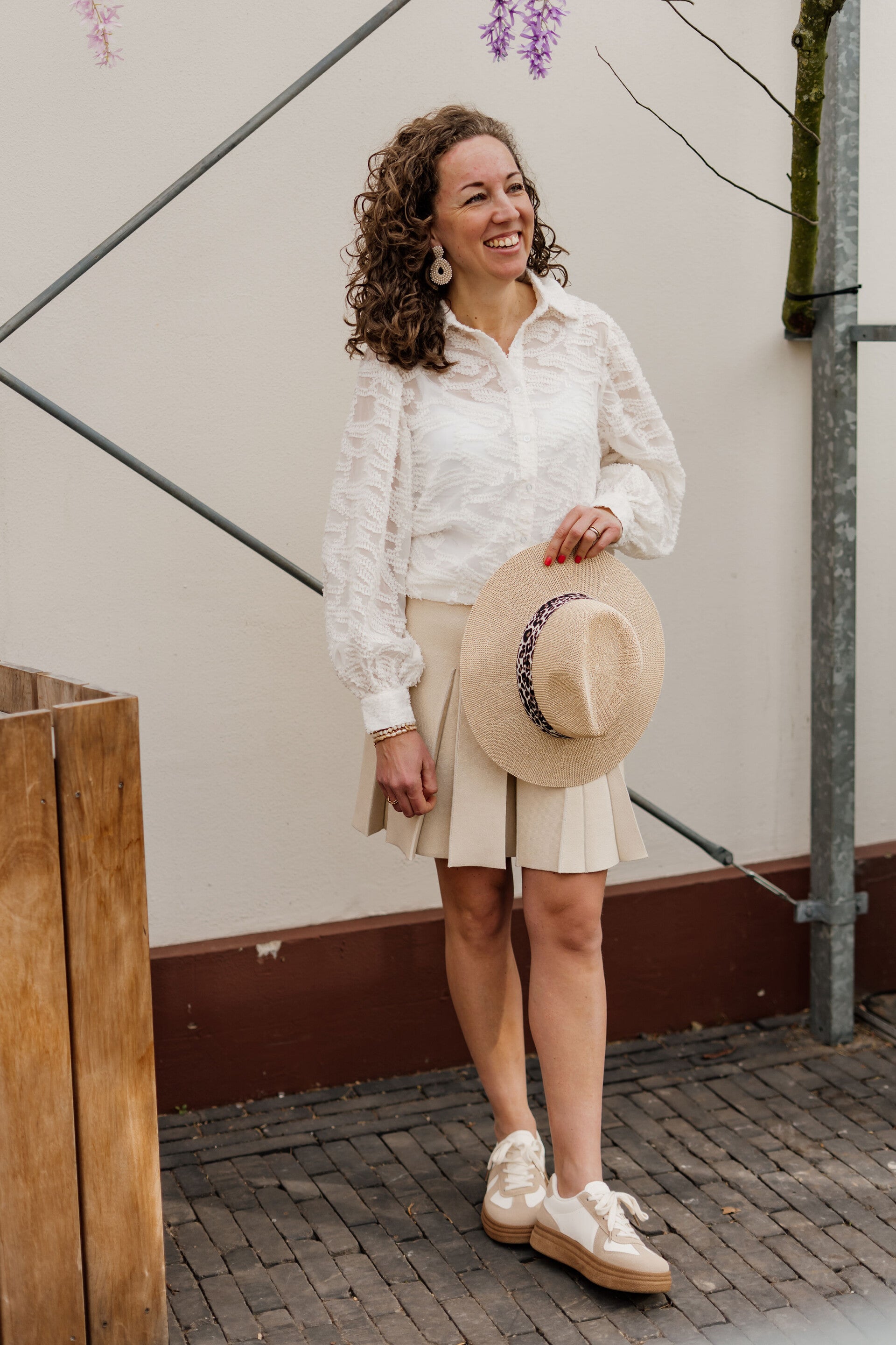 Favoriet plooi rokje van het merk By Clara. Verkijgbaar in de maten S/M en M/L. De stof bevalt veel stretch. Je shopt dit geweldige rokje in 3 kleuren: beige, wit en de trendkleur lichtblauw. Het rokje is 45 cm lang.