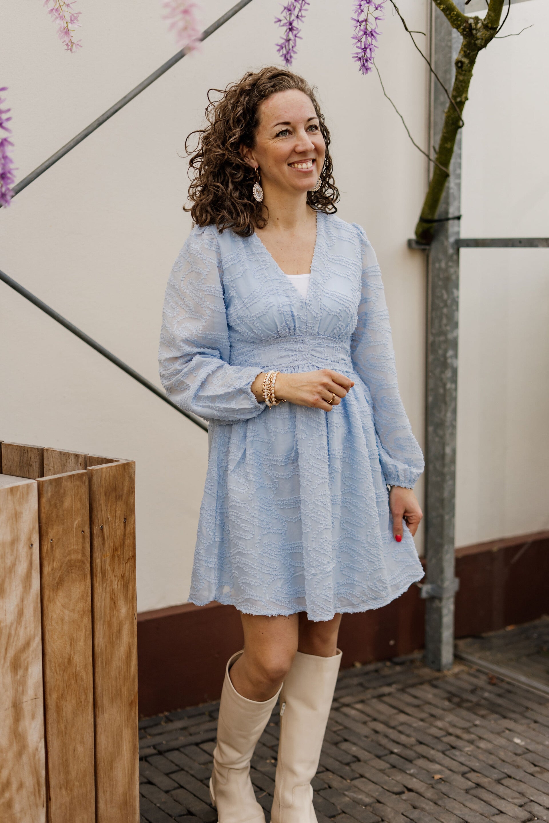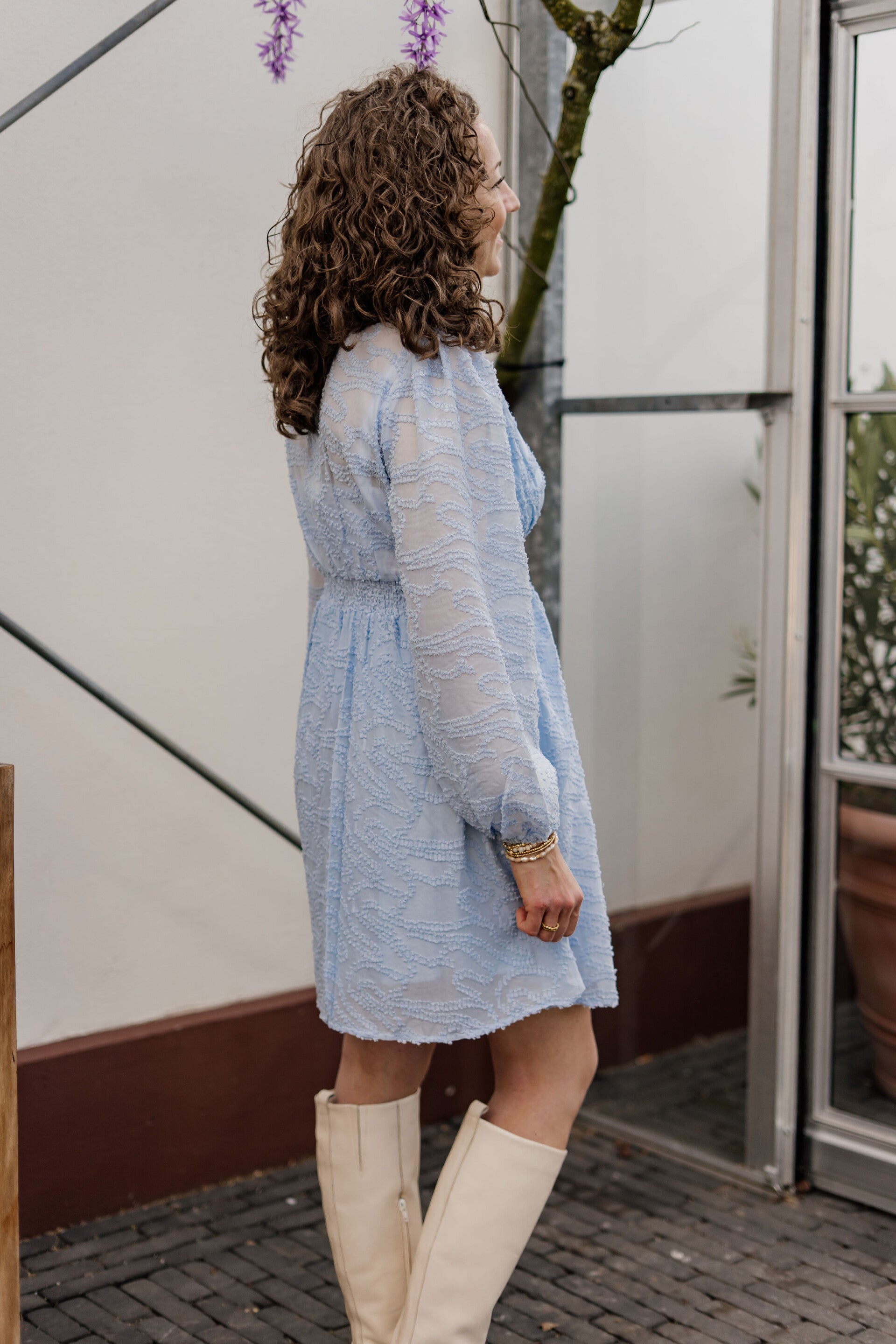 Dit jurkje is fantastisch voor het voorjaar én in de zomer! Het jurkje heeft lange mouwen en schijnt bij de mouwen iets door waardoor het ook op warmere dagen goed te dragen is. Op koudere dagen kun je het jurkje combineren met een gilet of vestje. Perfect voor een feestje!