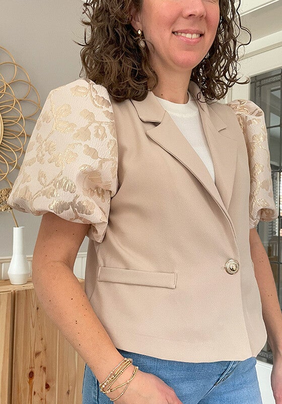 Deze blazer is écht prachtig, bevat mooie details en goede pasvorm. De blazer bevat pofmouwen met jacquard print in neutrale kleuren.