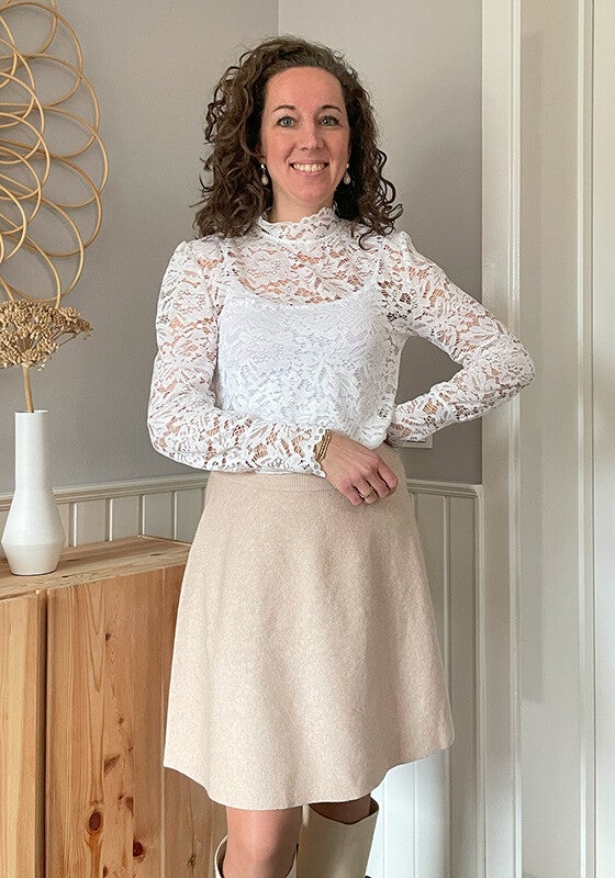 De rok heeft een subtiele a-lijn, elastische tailleband voor comfort en een perfecte pasvorm. Het rokje is van stevige stretch stof en 48 cm lang.