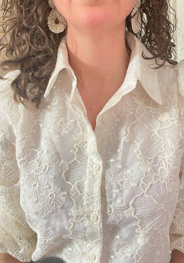 Prachtige blouse met pofmouw en opgewerkte details in brocante stijl. Deze blouse is gevoerd en schijnt daardoor niet door.