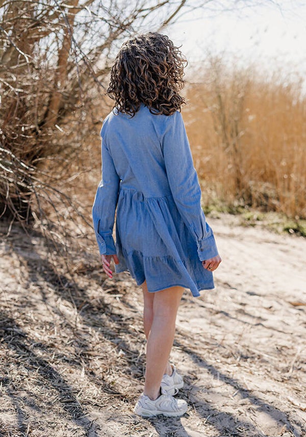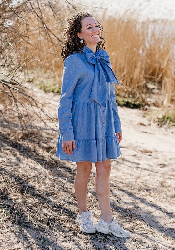 Geweldige denim jurk met strik en knoopjes. Lengte van de jurk is 90 cm.One size, geschikt t/m maat XL.Materiaal: 97% katoen, 3% elastaan