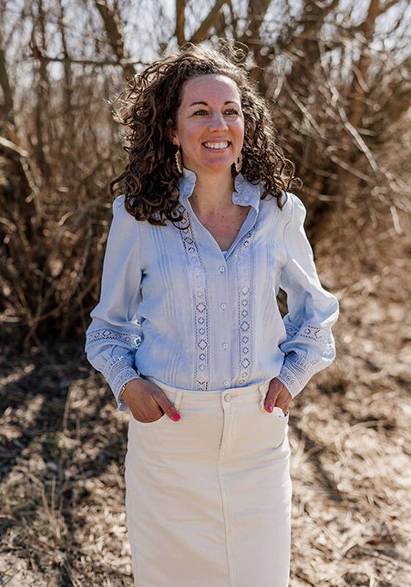 Deze prachtige blouse is echt een favoriet en afgewerkt met opengewerkt kant wat terugkomt bij de kraag en langs de knopen. De mouw bevat 3 kleine knoopjes.