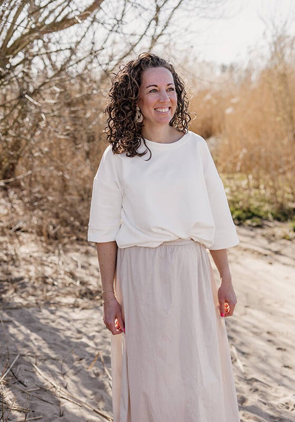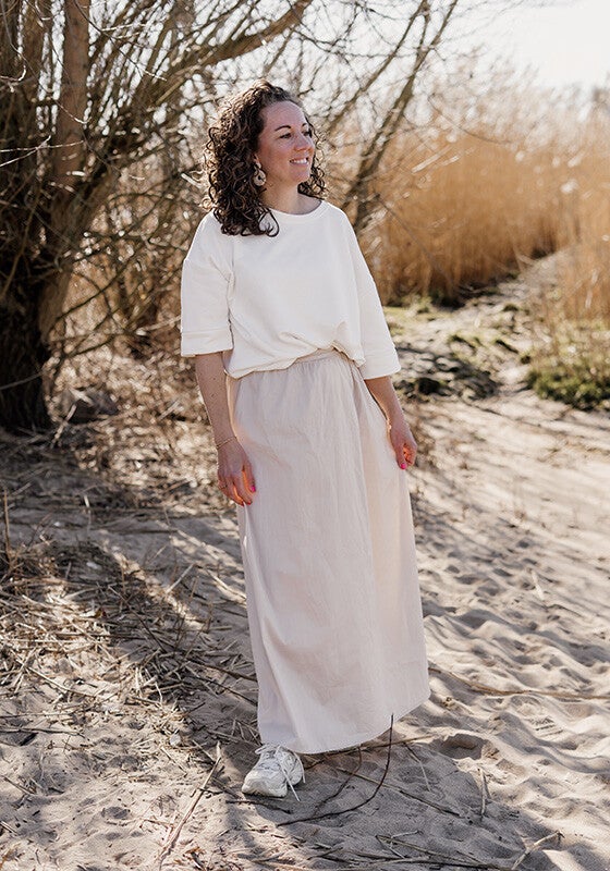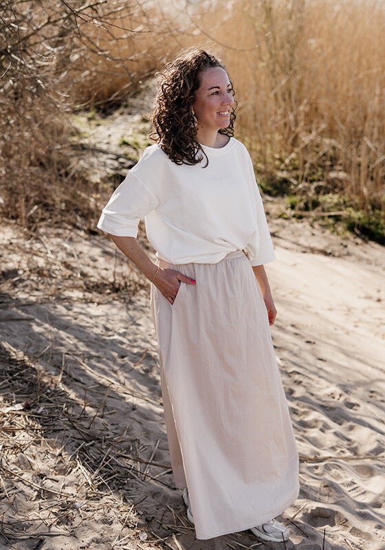 Mooie lange beige rok. One size, heeft elastiek in de taille en steekzakjes. Let op: de rok schijnt licht door. Lengte 103 cm