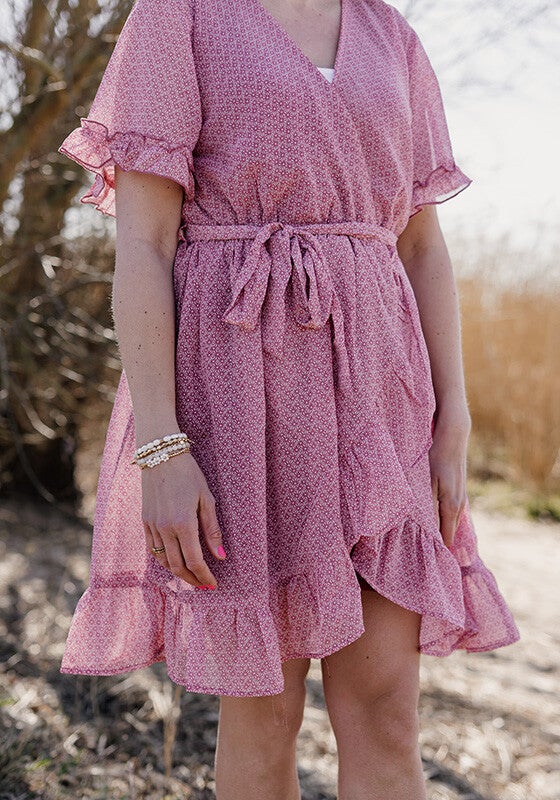 Deze elegante jurk is de perfecte combinatie van vrouwelijk en speels. De jurk heeft een V-hals, bevat een onderjurk en een elastische taille met strikceintuur, waardoor hij prachtig aansluit op het lichaam. De korte mouwen met subtiele ruffle-details geven een romantische touch. De asymmetrische rok met volants zorgt voor een speels en zwierig effect bij elke beweging.
