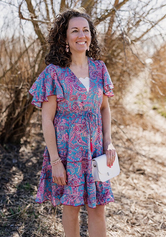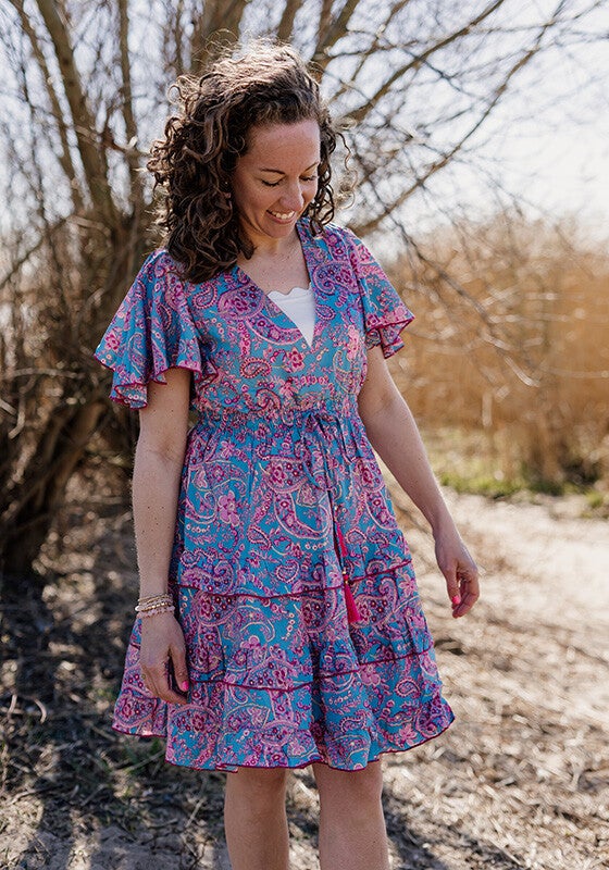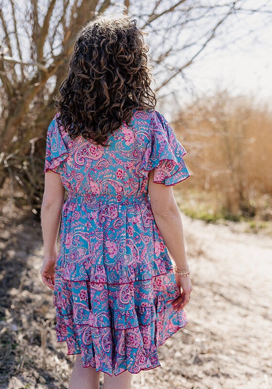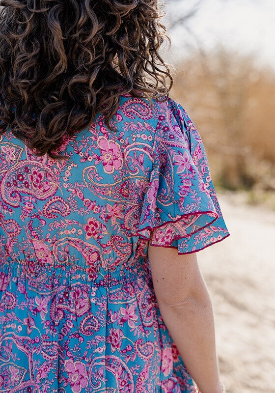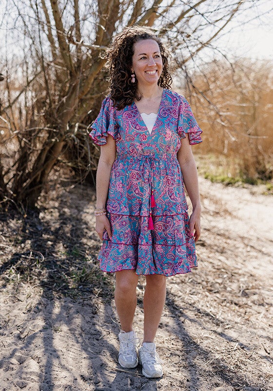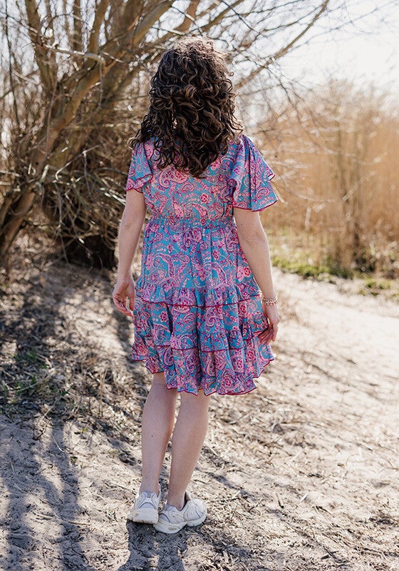 Deze prachtige bohemian jurk heeft een sierlijke paisley print met roze en blauw details. De jurk heeft een elegante V-hals en een elastische taille met een strikceintuur, waardoor hij perfect op maat te maken is. In verband met een wat diepere V-hals is de jurk perfect te combineren met het kartel hemd in witte kleur uit onze collectie.