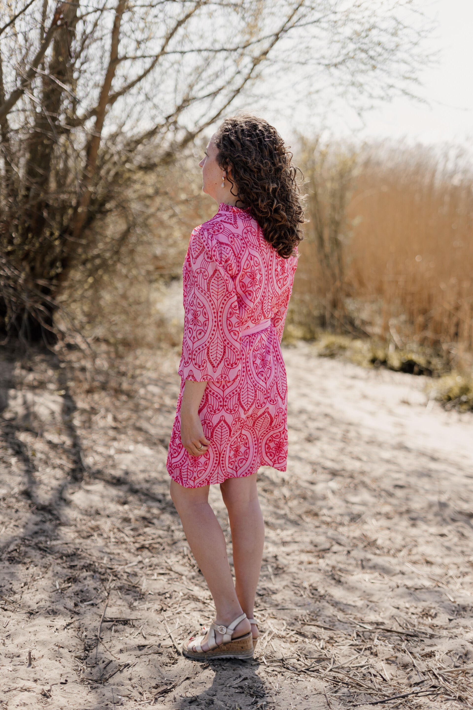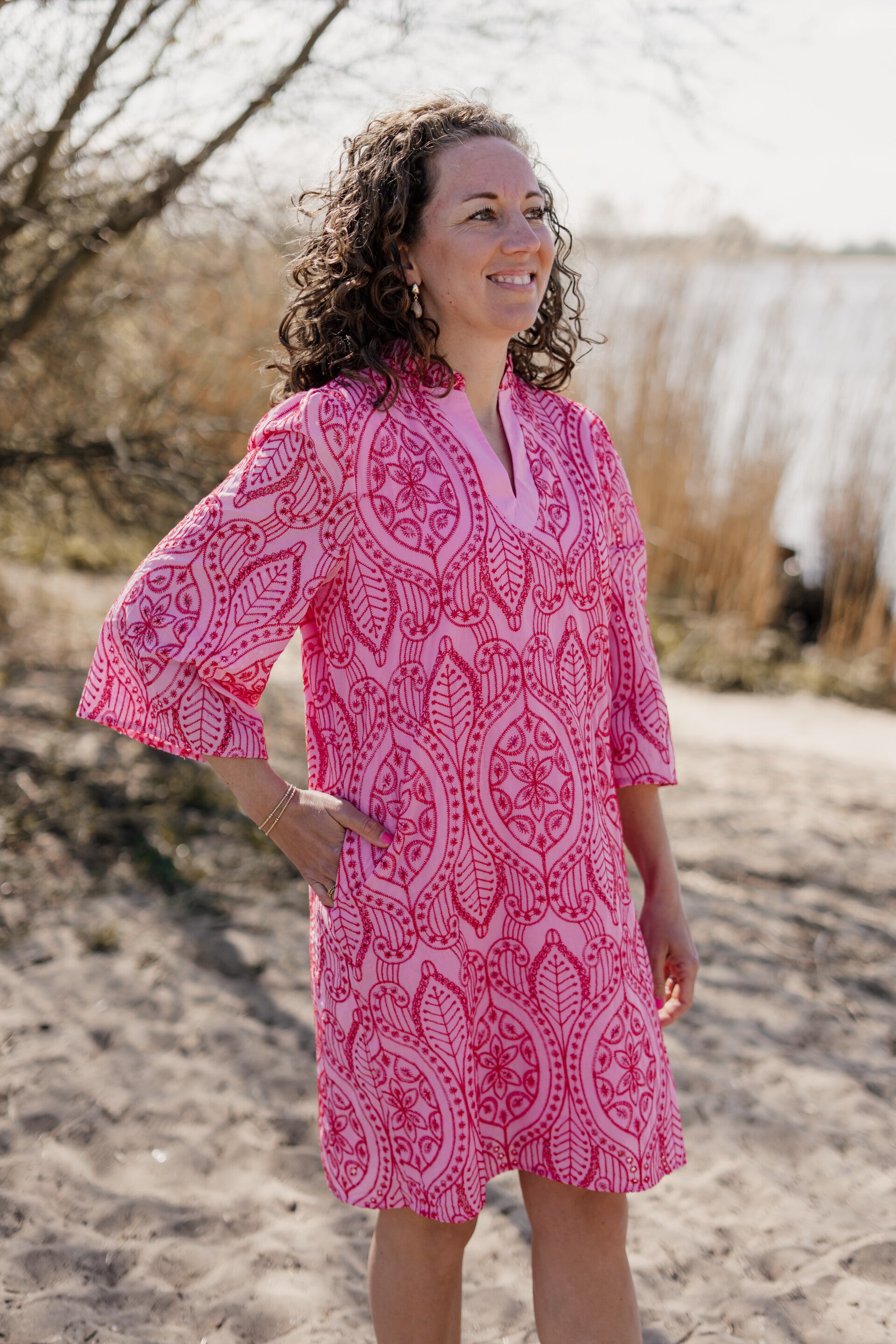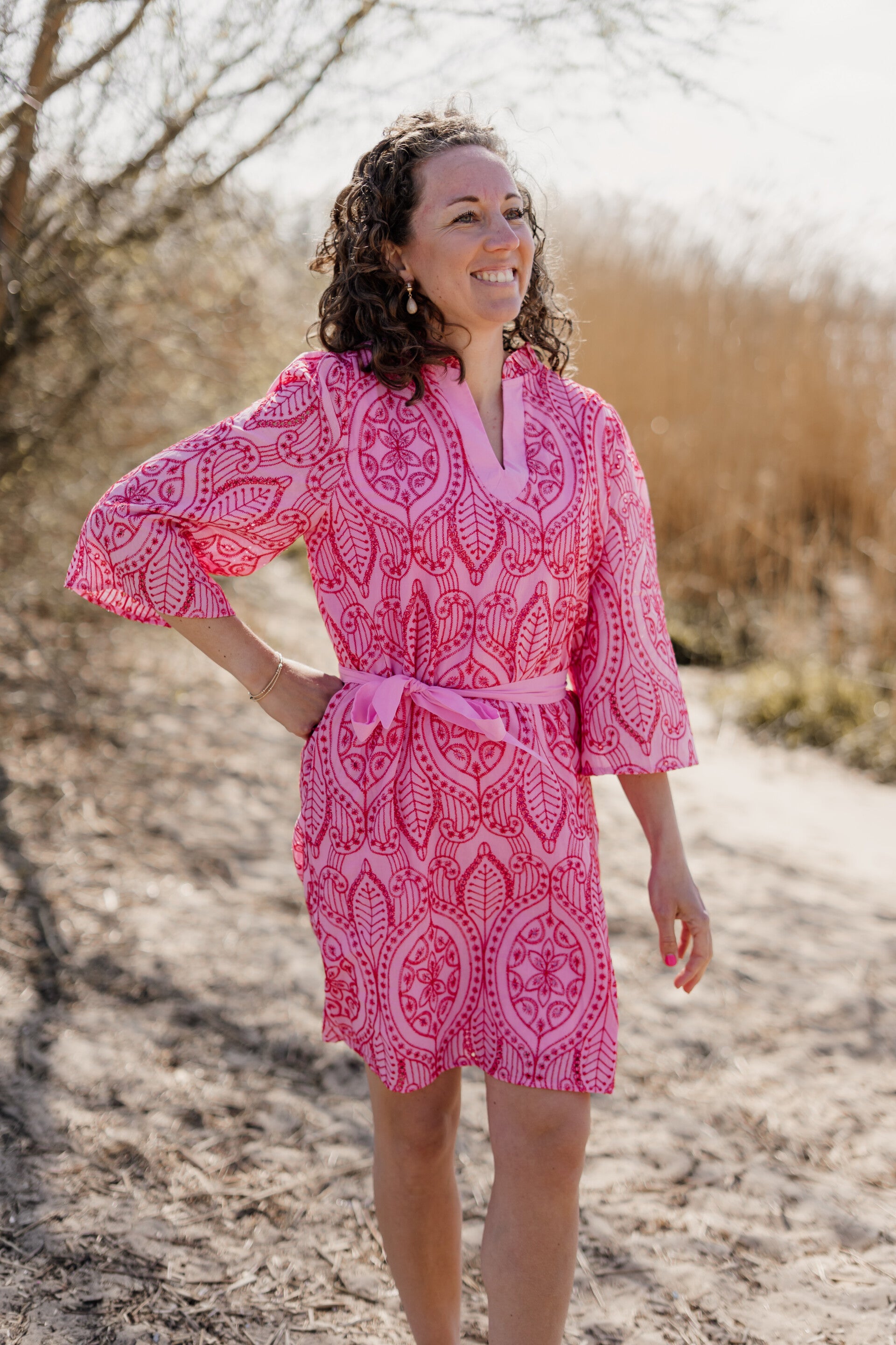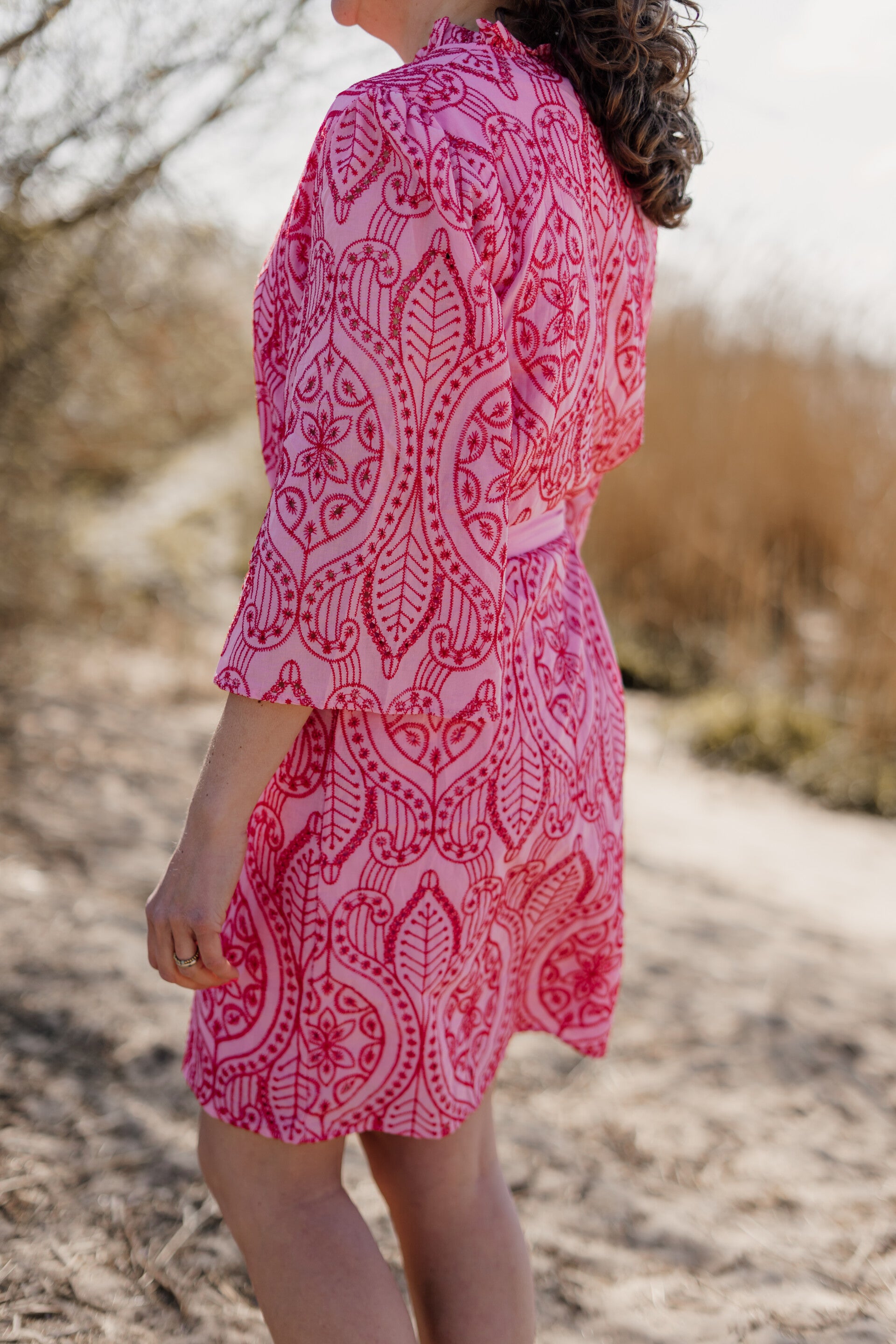 De broderie jurk is een must-have item in een opvallende roze/rode kleur. Het jurkje is gemaakt van hoogwaardige materialen en heeft een elegante pasvorm. De korte lengte en driekwart mouw maakt dit jurkje perfect voor zomerse gelegenheden. De jurk kun je tailleren met de bijpassende ceintuur maar is ook zonder leuk te dragen!