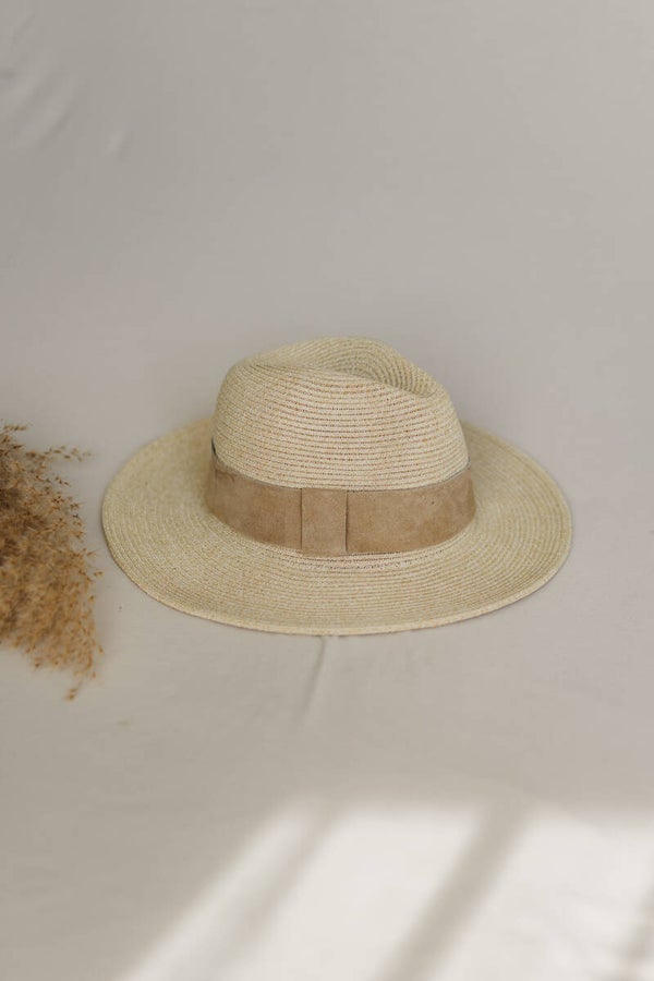 Zomerhoed met een band van echt leer/suède in taupe kleur.De hoed is aan de binnenkant dmv een touwtje verstelbaar.