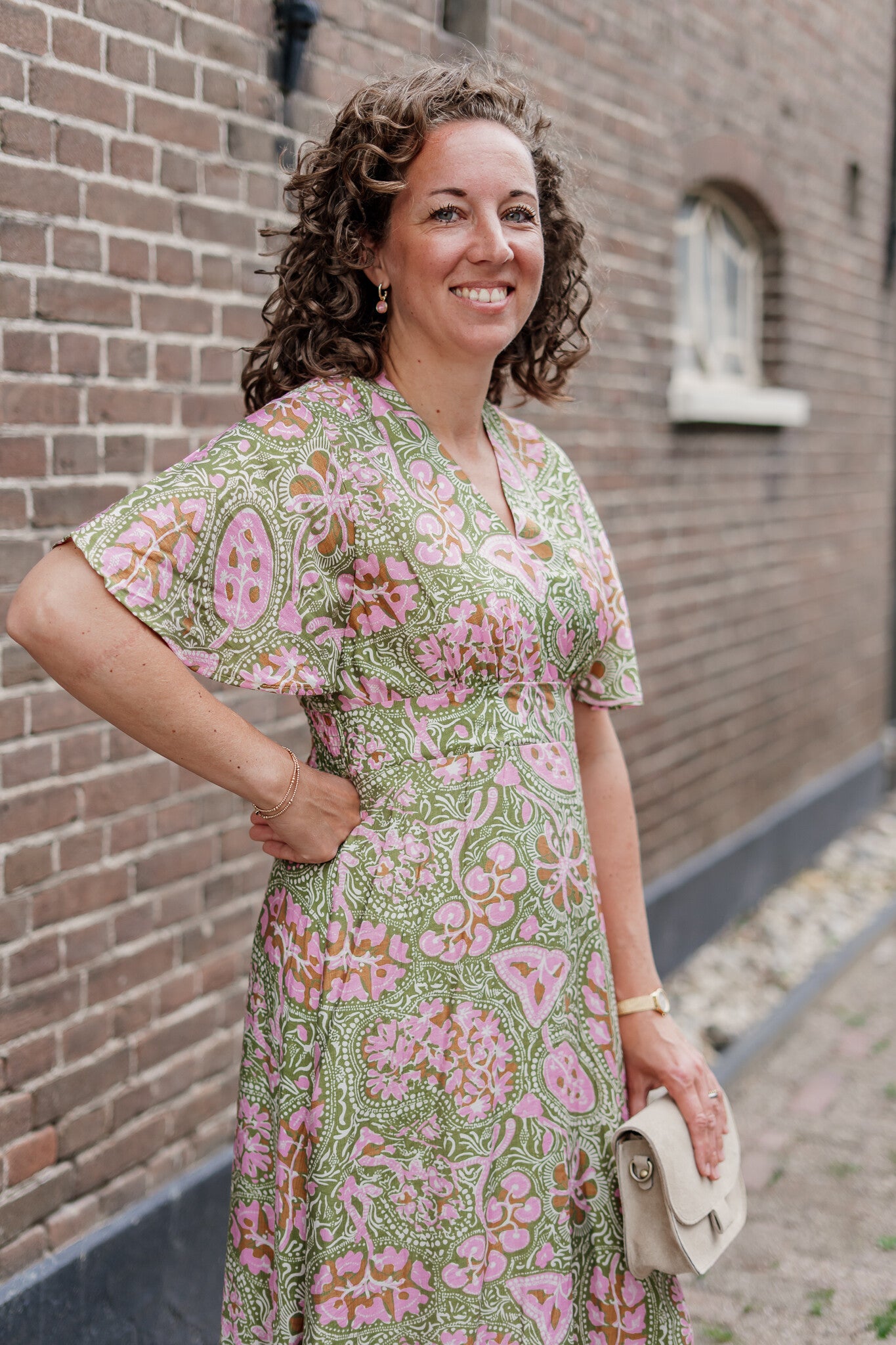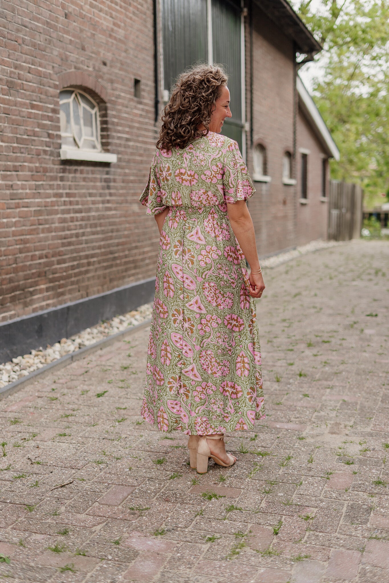 De jurk is 134 centimeter lang. Verkrijgbaar in maat S/M en L/XL. Mariëlle draagt maat S/M en is 1.68 cm lang. Materiaal: 50% viscose, 50% polyester