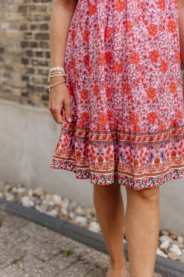 Deze Azzurro jurk met fleurige bloemenprint heeft wijde mouwtjes en een V-hals. De jurk heeft een strikdetail bovenaan en loopt wijd uit. Doordat het jurkje is gemaakt van een luchtige stof, is hij heerlijk comfortabel voor de warmere dagen! Hou je meer van getailleerde jurkjes, dan is dit niet jouw model!