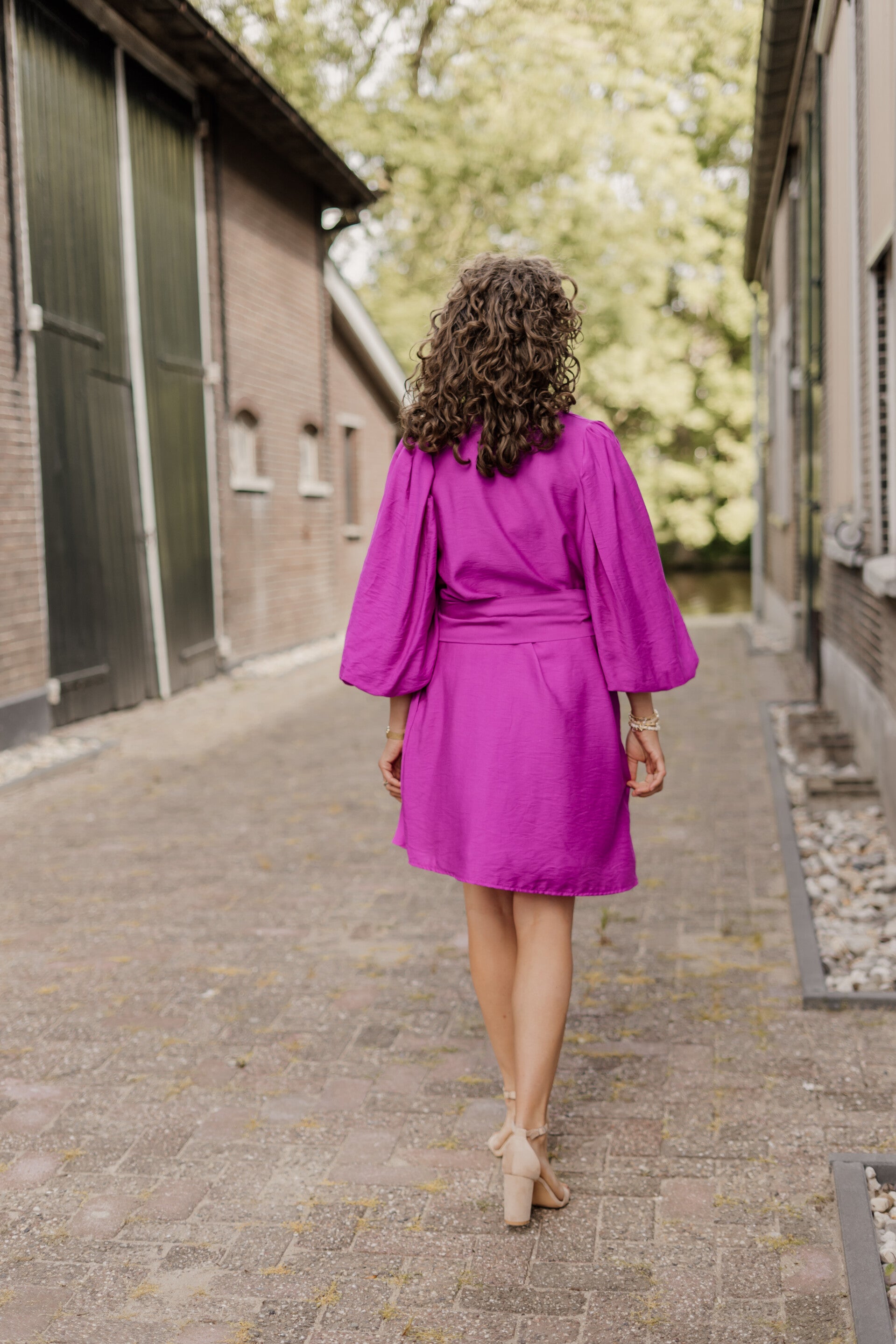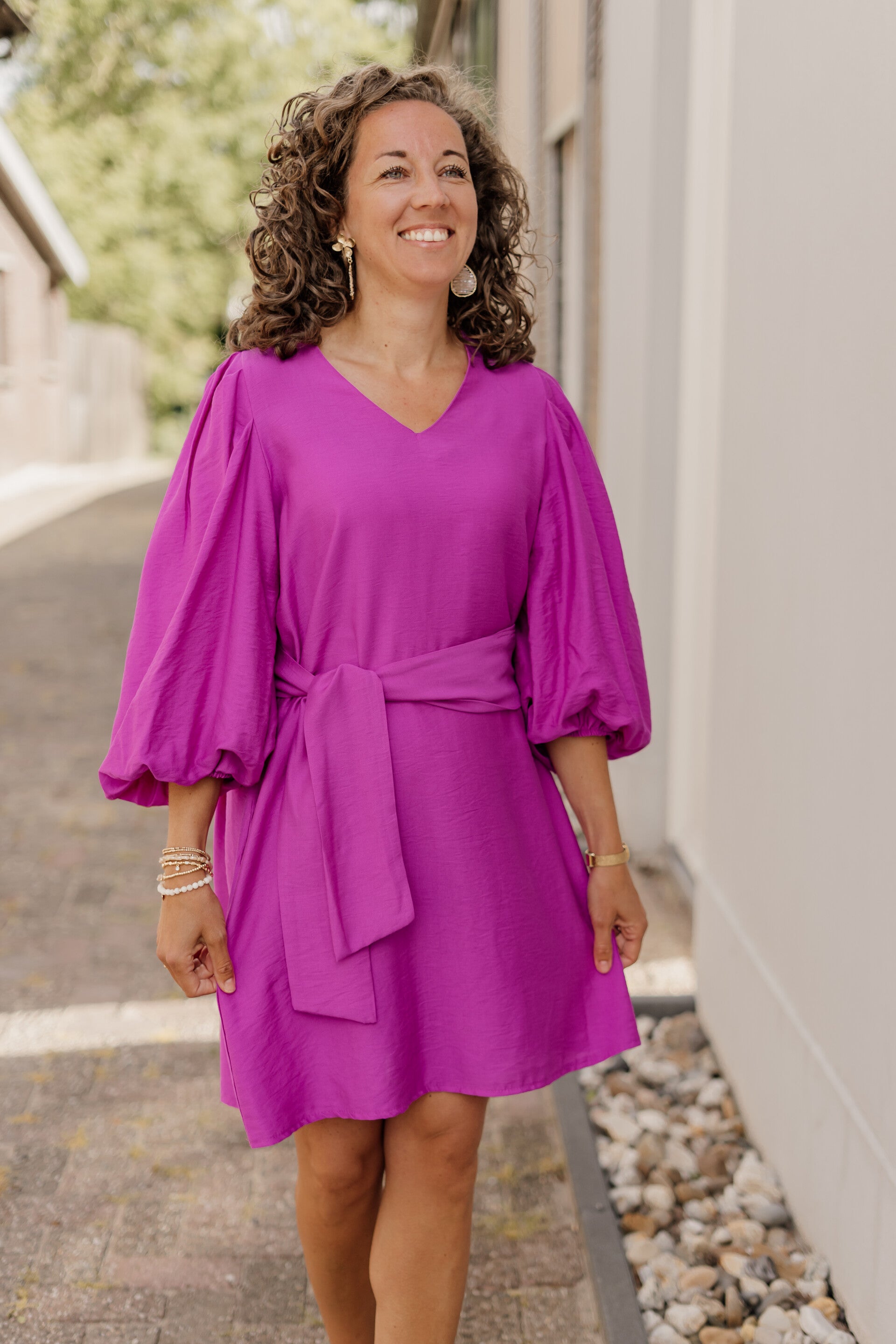 Deze jurk in een mooi magenta tint straalt elegantie en comfort uit. Met driekwart pofmouwen, vrouwelijke V-hals en bijpassende brede ceintuur is deze jurk perfect om zowel casual te dragen of geschikt voor een stijlvolle gelegenheid.