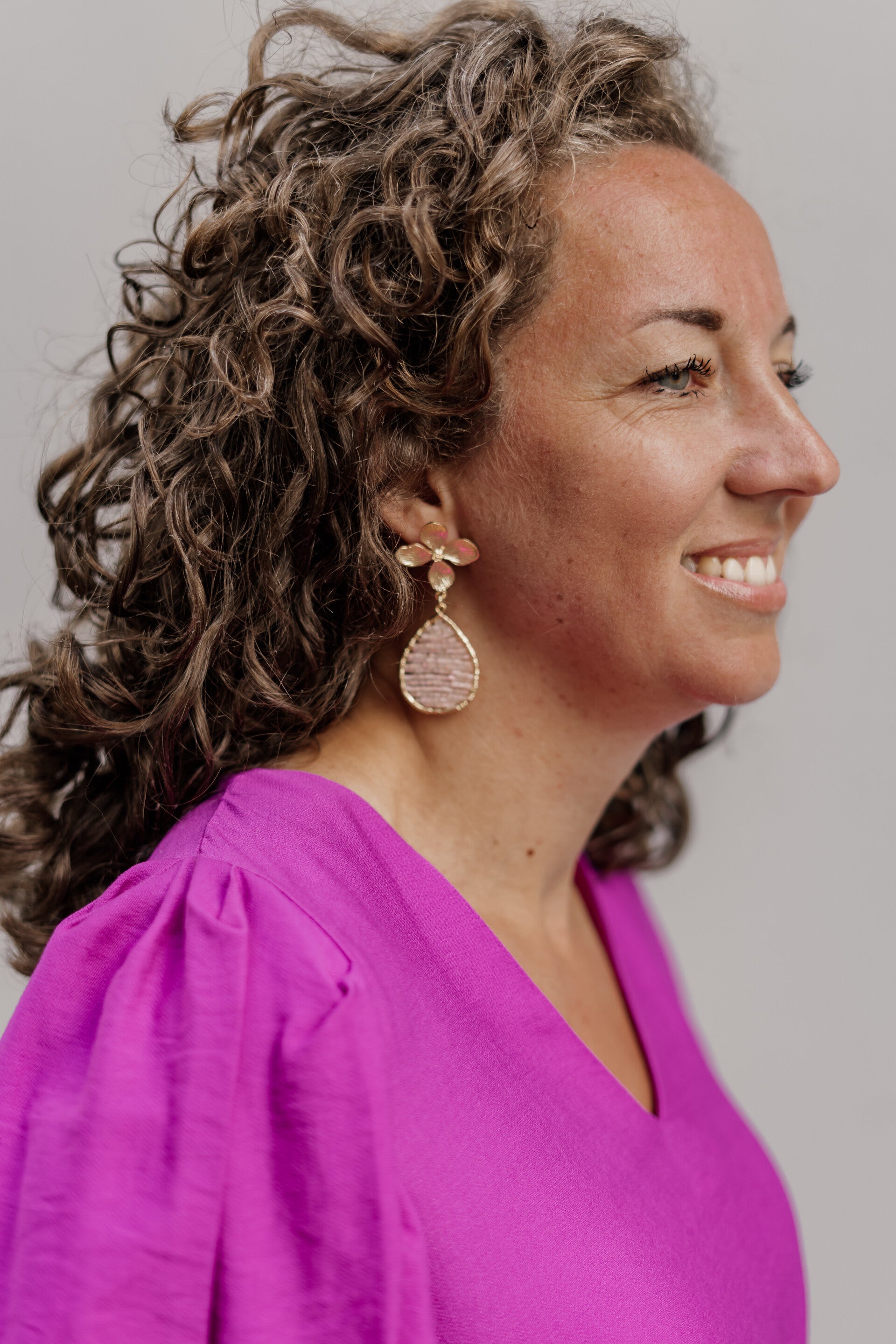 De jurk is verkrijgbaar in beige, magenta en lila. Lengte van de jurk is 96 cm (zonder ceintuur). Mariëlle is 1.68 m en draagt maat S/M.