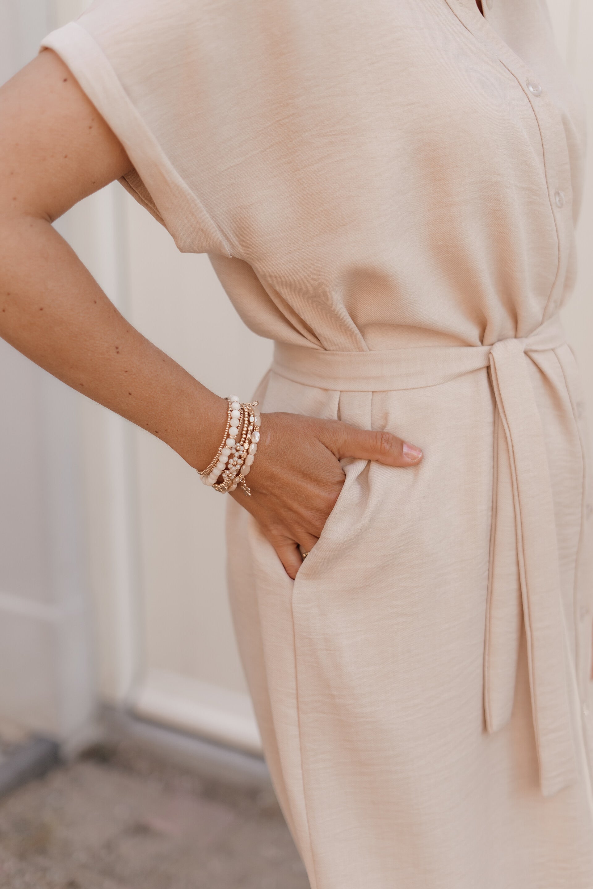 Deze fijne midi jurk met knoopjes is een nieuwe favoriet voor warme dagen! Gemaakt van een soepelvallende stof die heerlijk luchtig draagt en mooi meebeweegt met elke stap. De jurk is volledig doorknoopbaar van boven tot onder, wat zorgt voor een speelse en veelzijdige look.