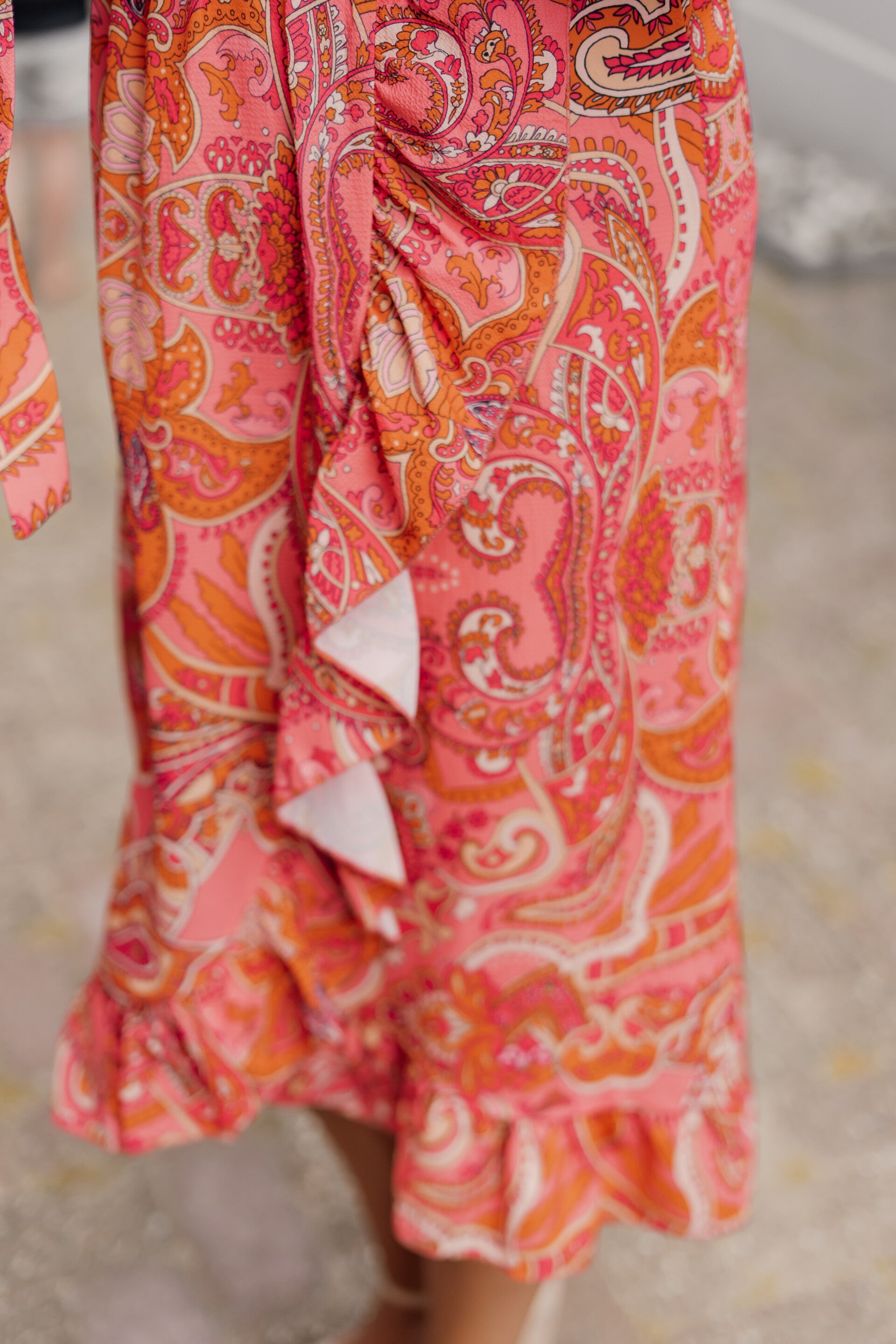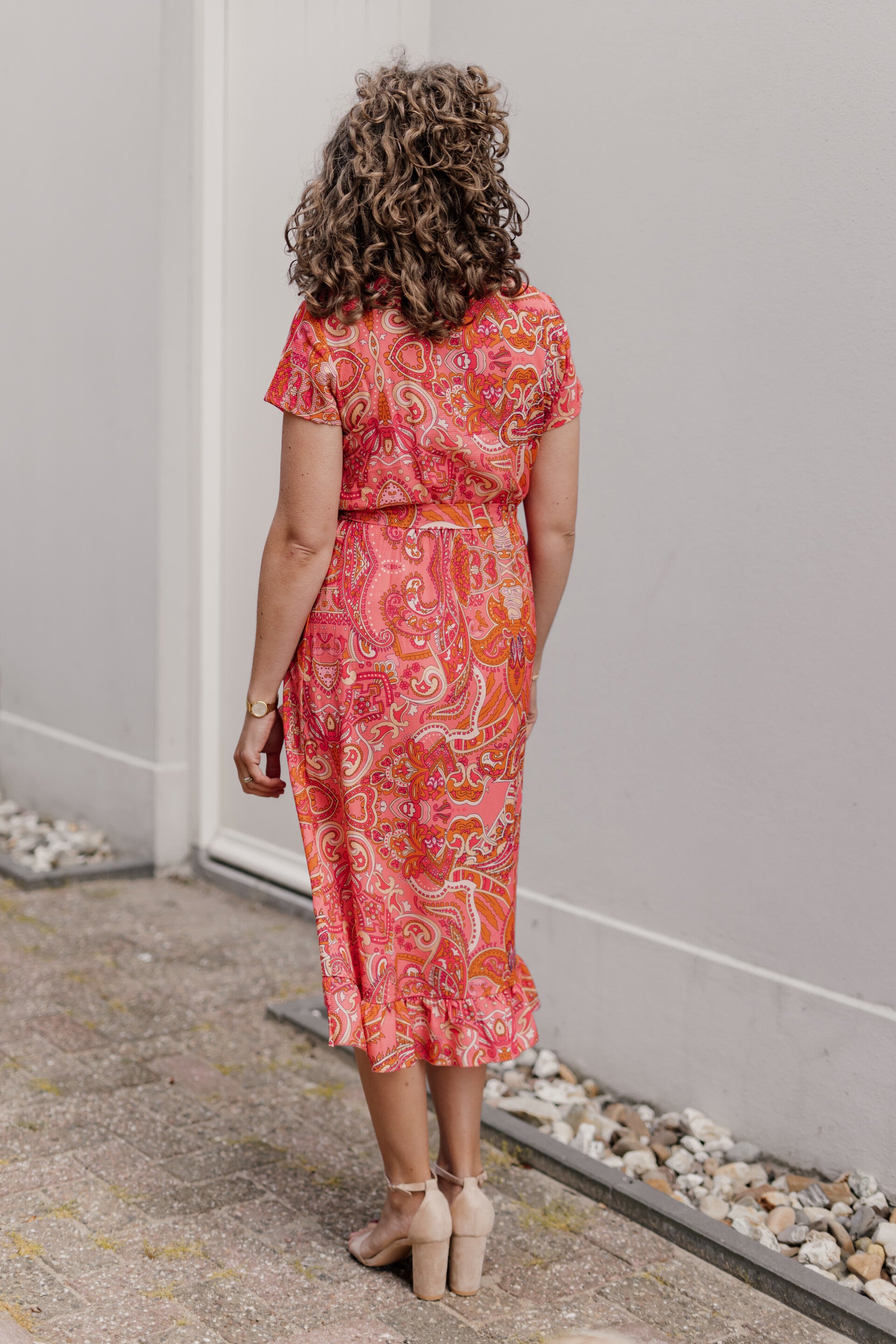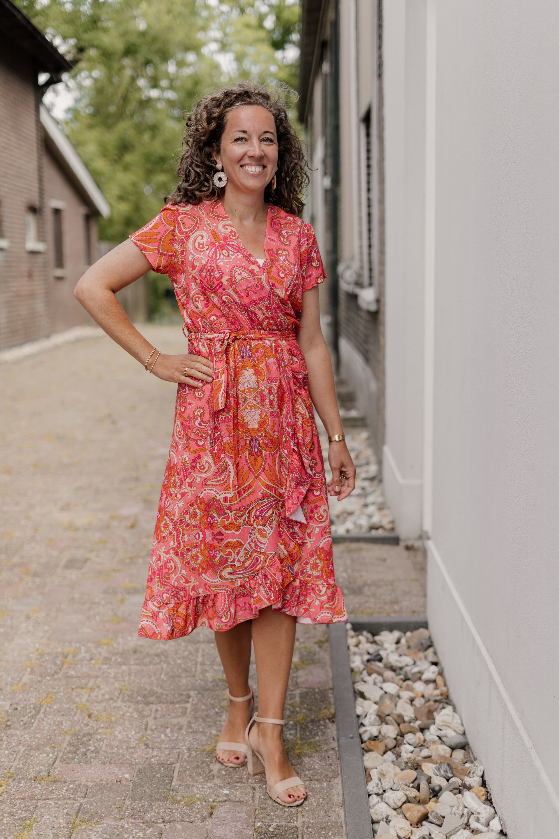 Zomers, vrouwelijk en heerlijk comfortabel! Deze fleurige overslagjurk is uitgevoerd in een luchtige stof met een kleurrijke paisley print in beige, roze en oranje tinten – dé perfecte combinatie voor zonnige dagen.