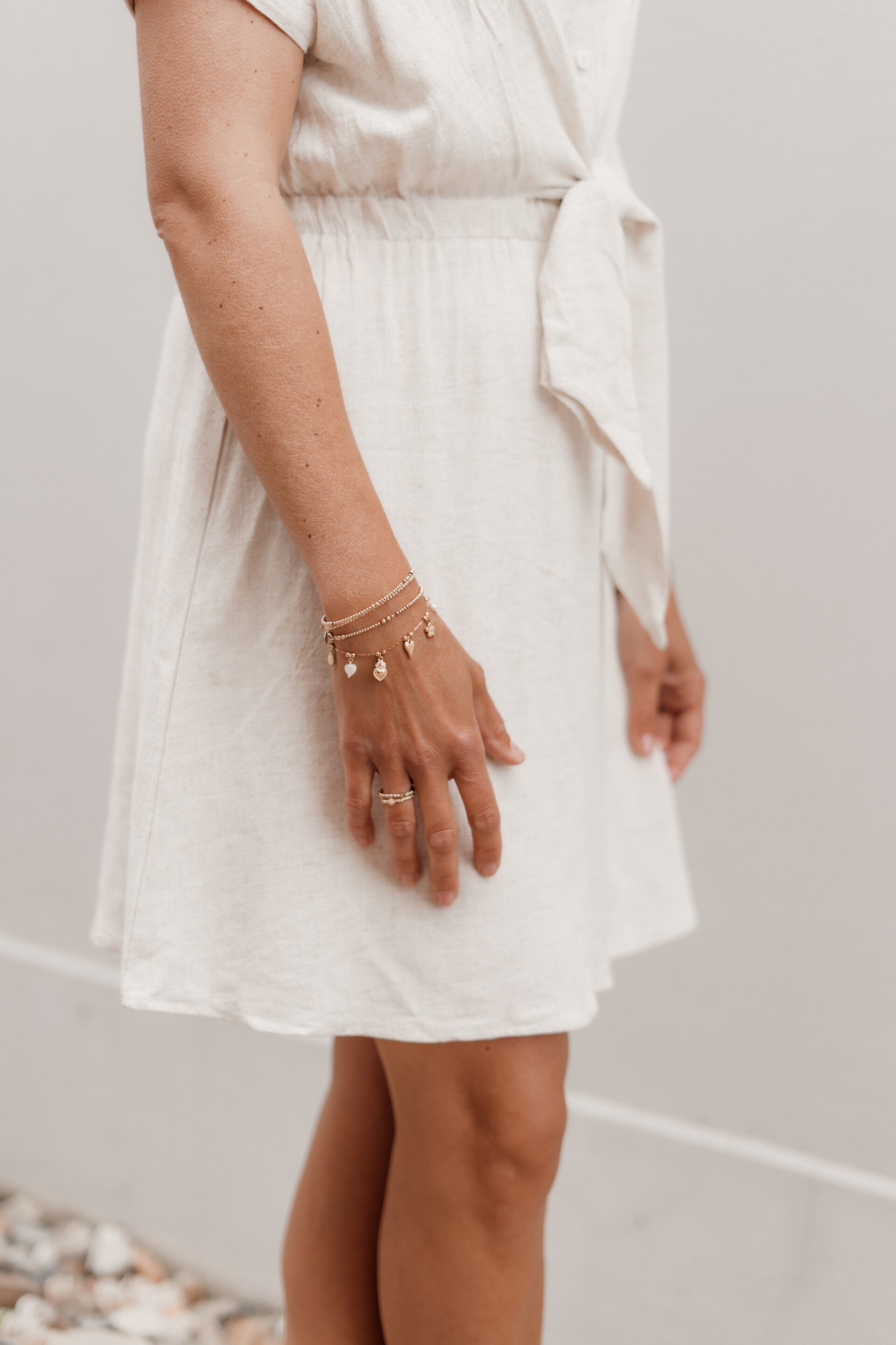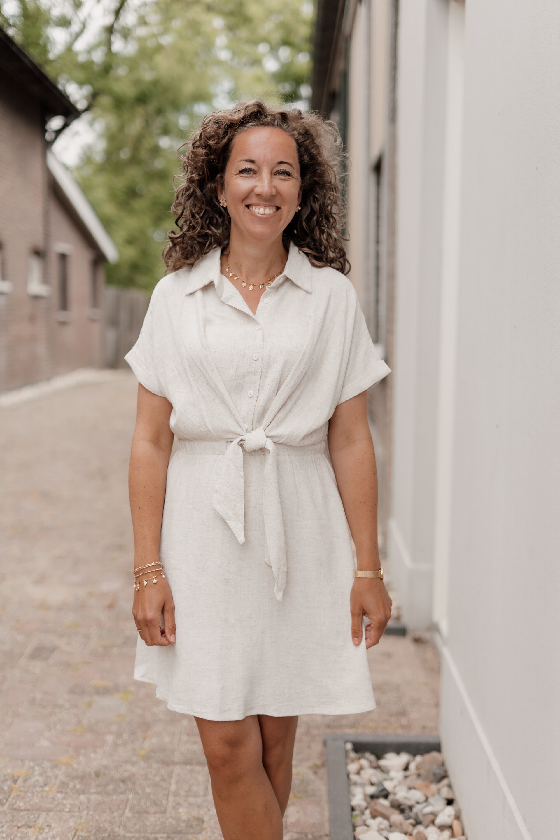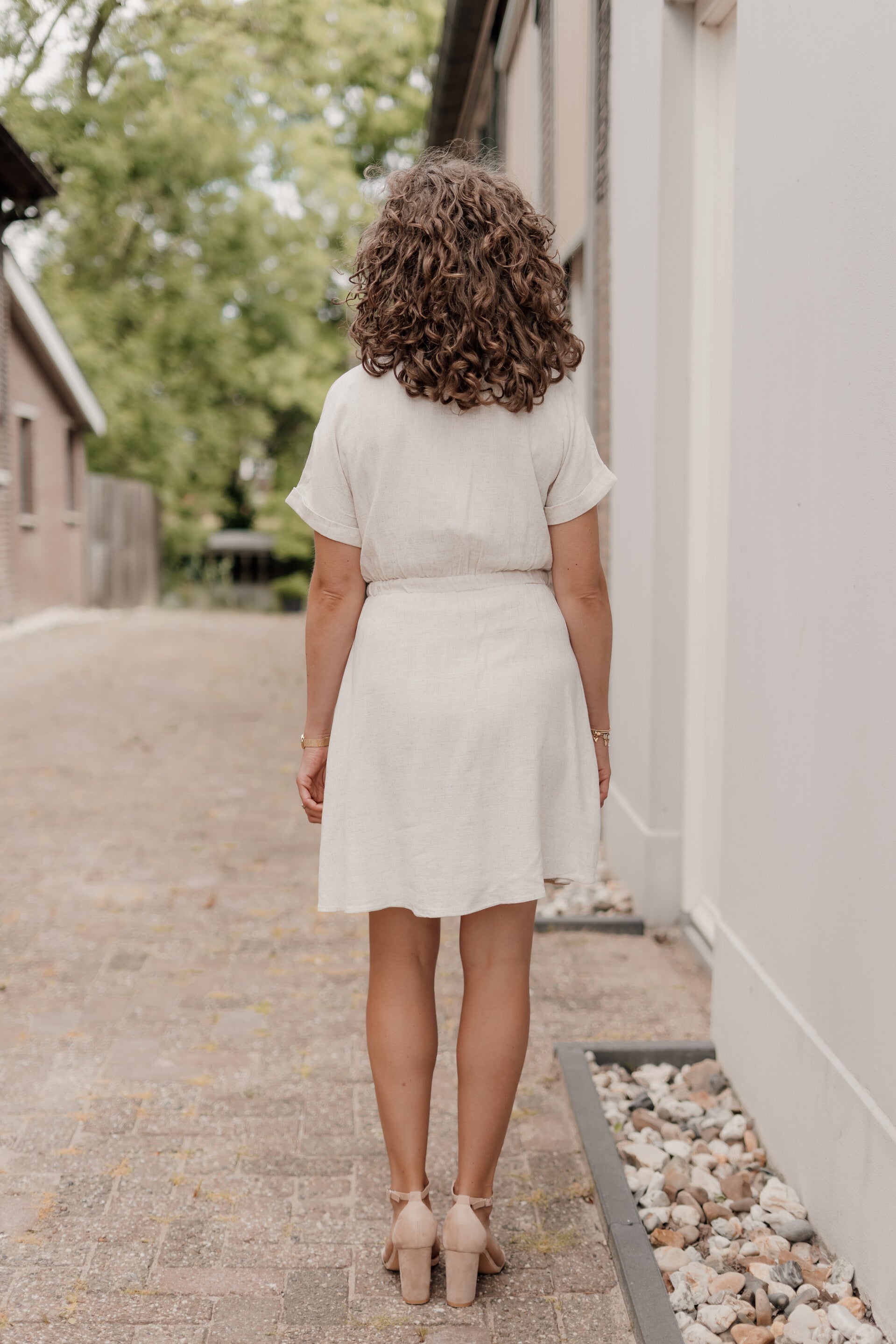 Elegant, luchtig en helemaal van nu! Dit neutrale korte linnen jurkje is perfect voor zomerse dagen en straalt pure eenvoud uit. Gemaakt van een mooie gemêleerd beige stof, met een elastische tailleband en een vaste ceintuur die je kunt strikken met een subtiel knoopje – ideaal om je taille mooi te accentueren.