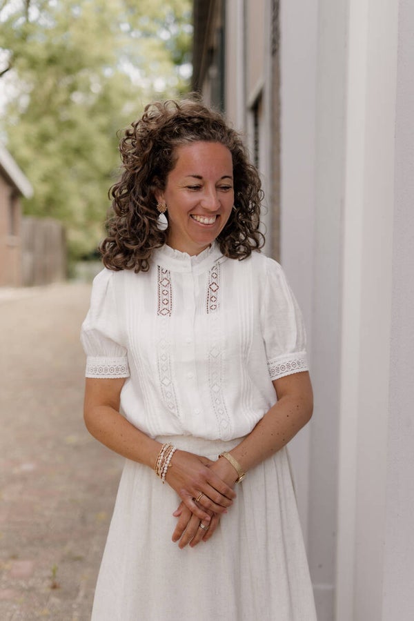 Onze bestseller kanten blouse nu ook weer terug in korte mouw! Prachtige witte blouse en mooi te combineren met de linnen rok.