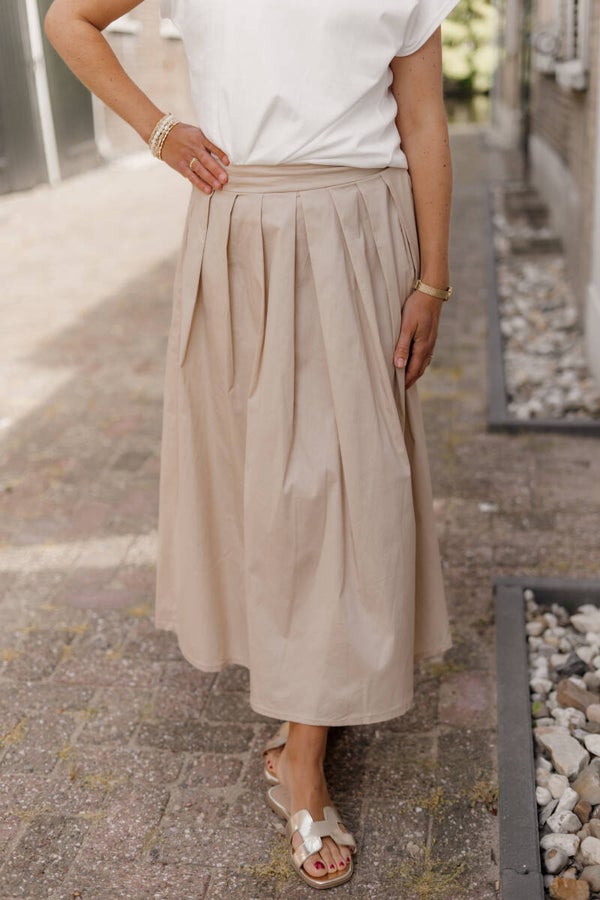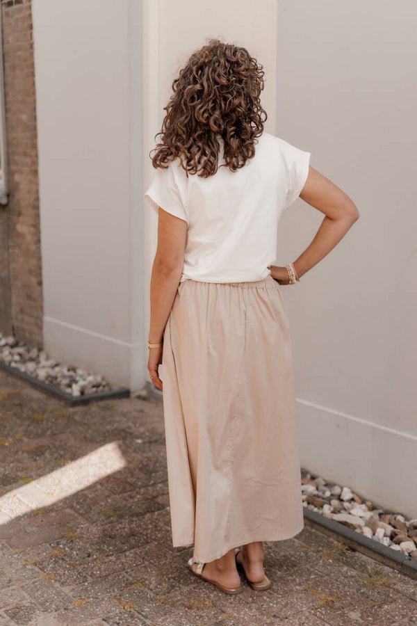 Deze luchtige beige rok is een veelzijdig item dat je goed combineert met je favoriete tops en blouses. Ook heel mooi te dragen met het t-shirt met geborduurde bloemen, de kleur komt mooi terug in de rok. De elastische tailleband zorgt voor een comfortabele pasvorm en maakt de rok geschikt voor verschillende lichaamstypes.