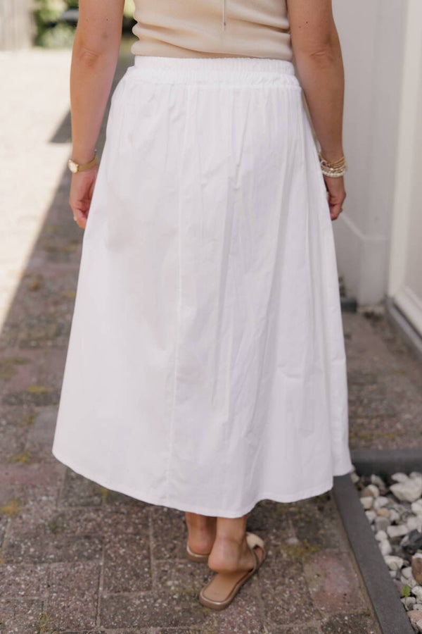 Deze lichte, witte katoenen rok is een perfect basisstuk voor de zomer. De elastische tailleband zorgt voor een comfortabele pasvorm en maakt de rok geschikt voor meerdere maten. De rok is One Size en te dragen van maat S t/m een ruime L.
