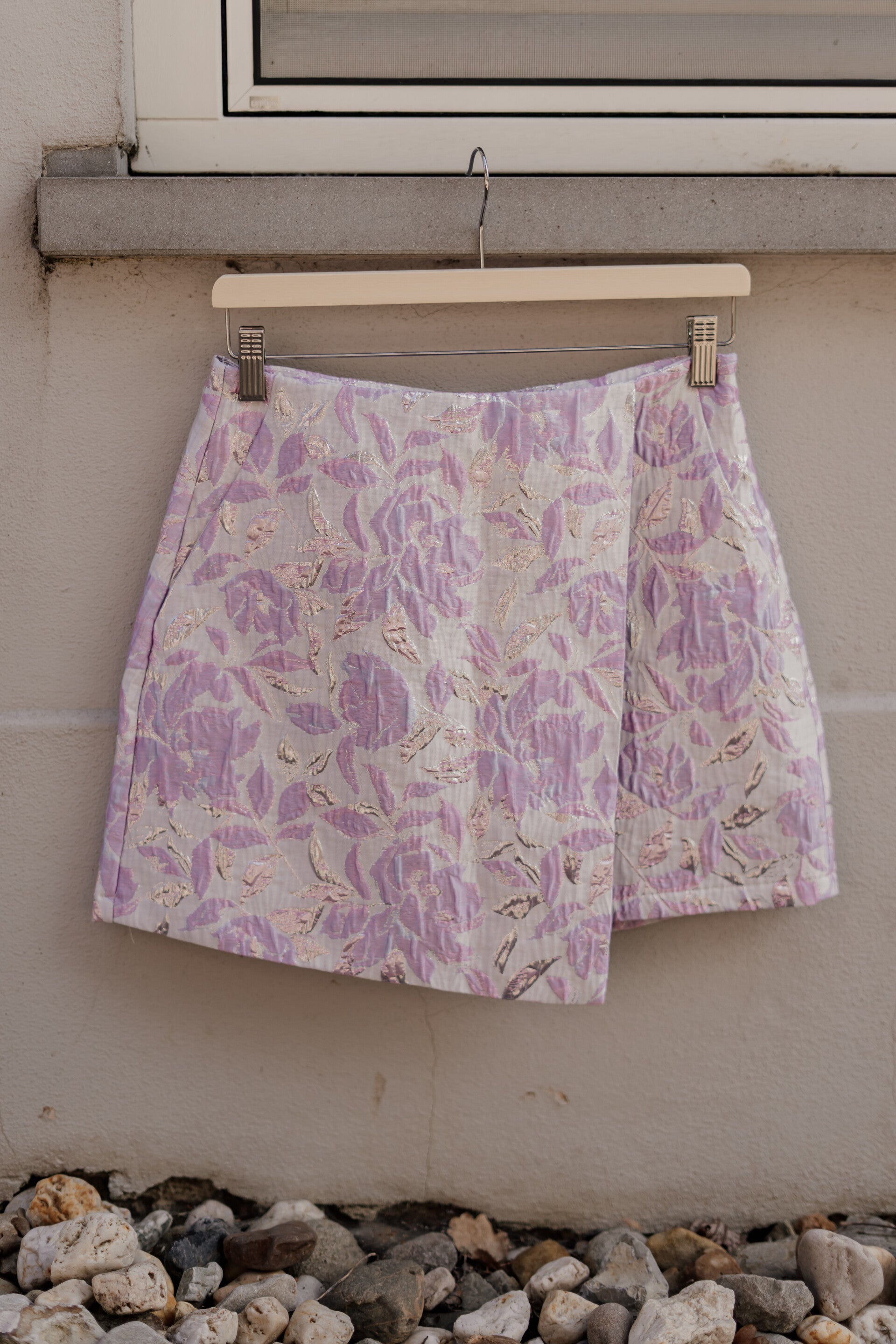 Kort rokje met overslag in mooie bloemen print met lila kleur. In het rokje zit een binnenbroekje.