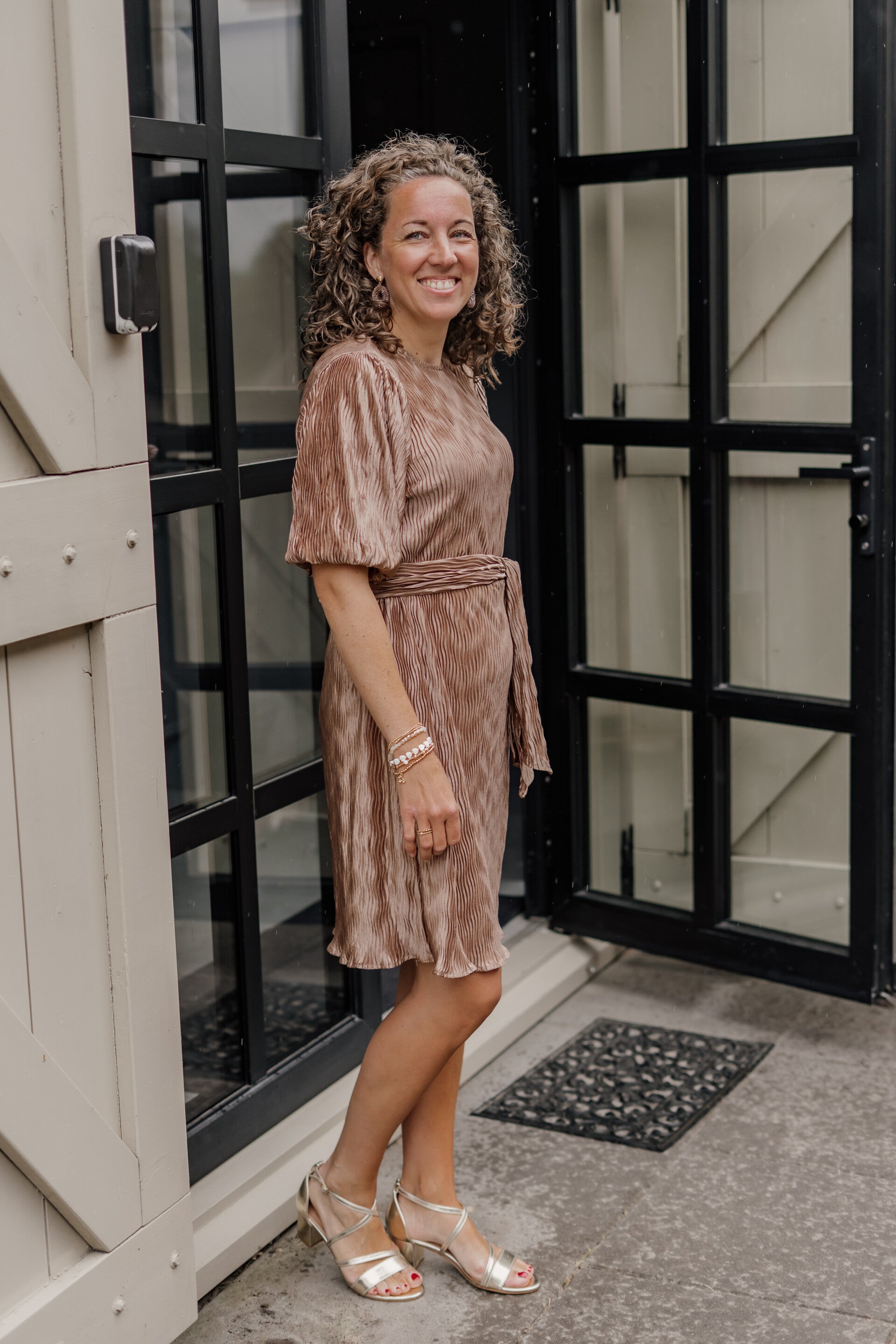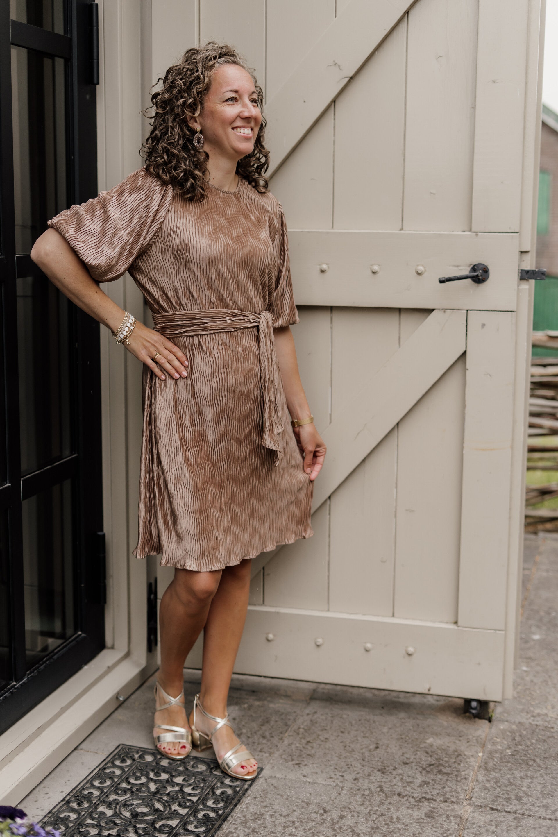 Deze prachtige plissé jurk in bruine/bronze kleur is gemaakt van een luchtige plisséstof die sierlijk meebeweegt en heerlijk comfortabel zit. De jurk heeft een los vallend model en is daardoor zowel mét als zonder ceintuur prachtig te dragen. Zonder ceintuur valt de jurk soepel en losjes om het lichaam, ideaal voor een nonchalante maar vrouwelijke look. Extra fijn: de jurk is voorzien van steekzakken – praktisch én stijlvol!