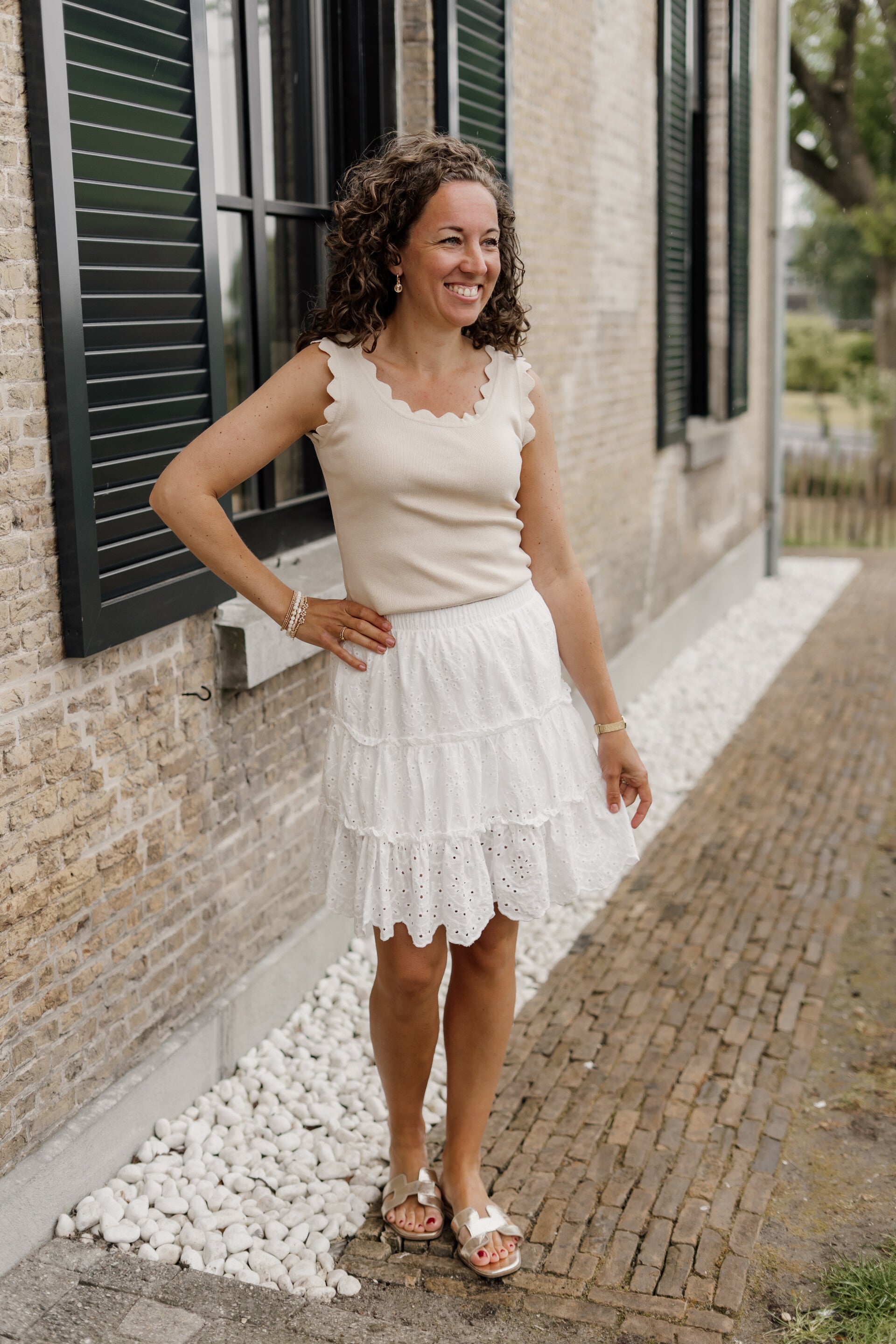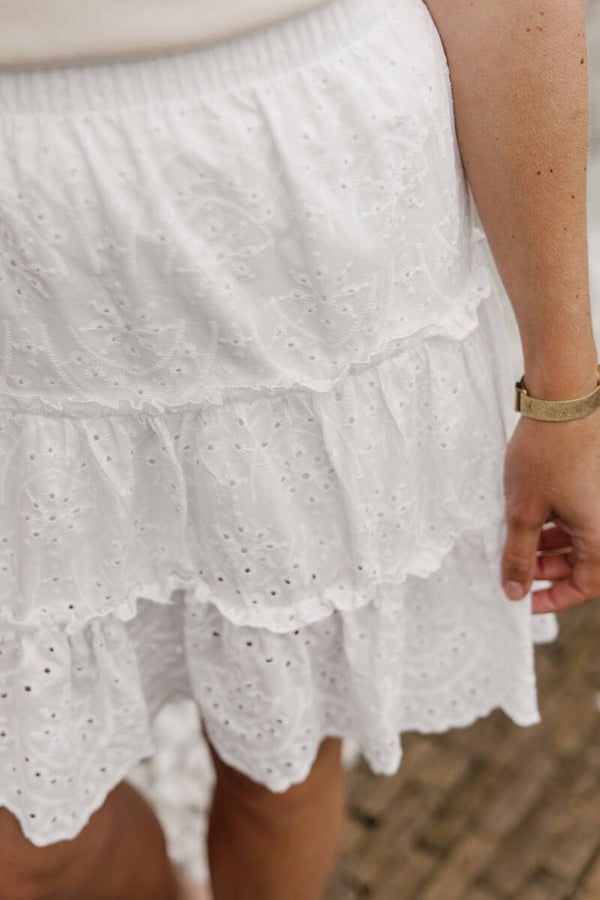 Prachtig wit rokje met broderie details. Het rokje bevat een elastieken boord aan de bovenkant en een onderrokje waardoor deze niet doorschijnt.