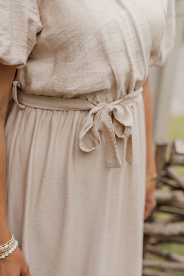 Must-have lange jurk in prachtige zand kleur. De jurk is een one size, geschikt voor maat S t/m L (ruime maat L). Stijl de jurk af met bijpassende tas, oorbellen en espradilles (zie foto's).