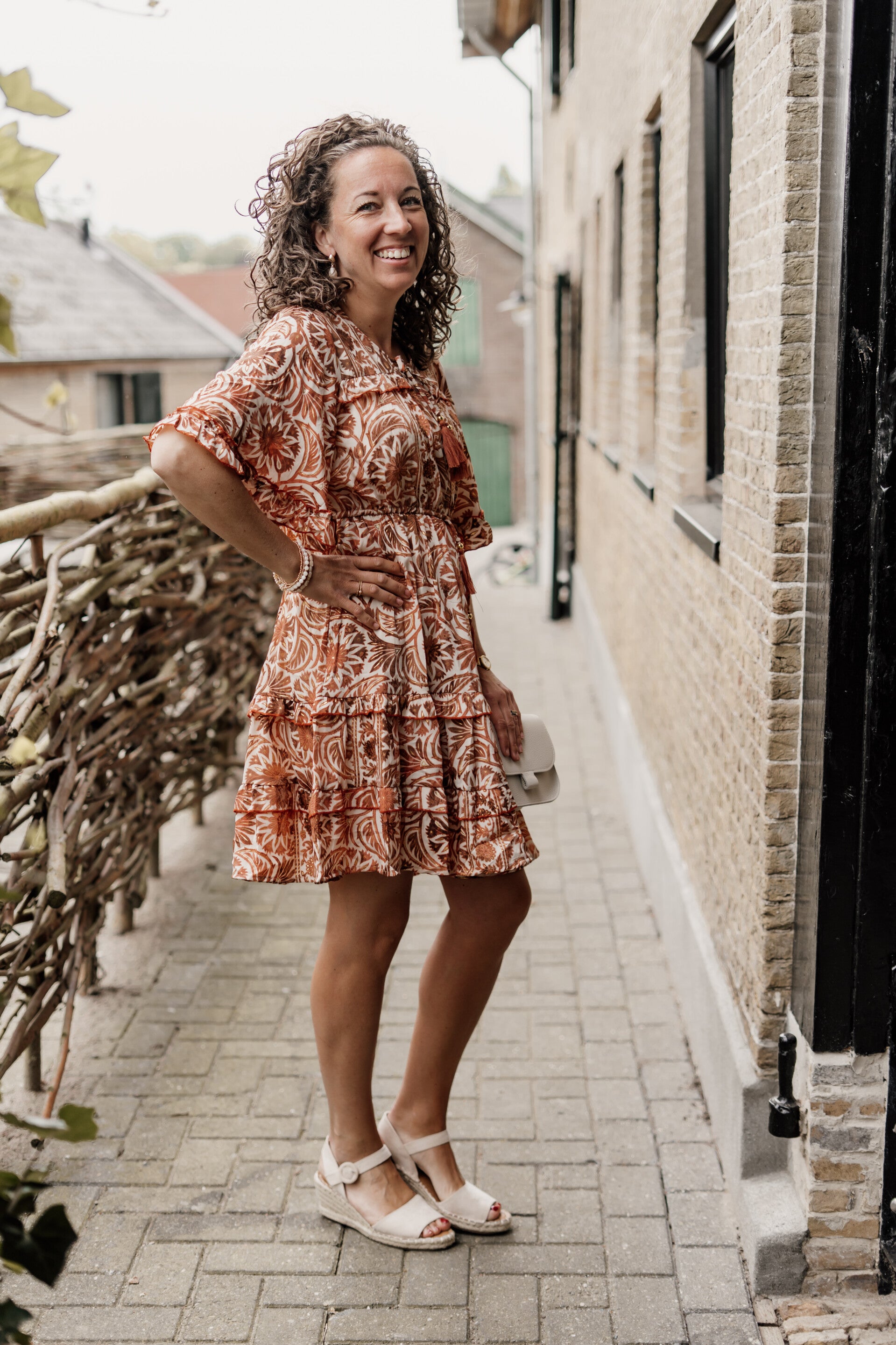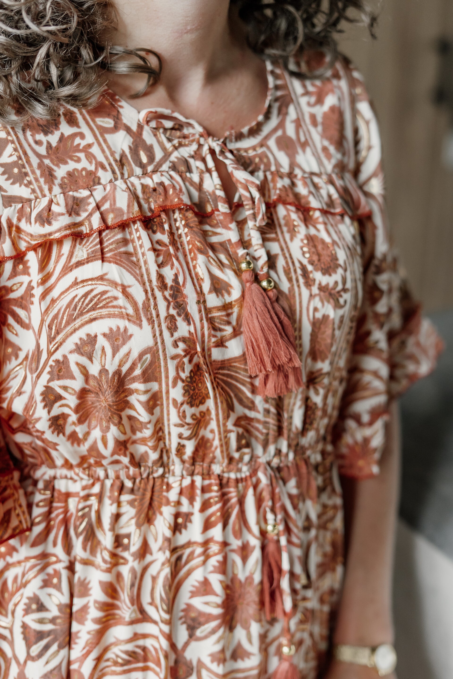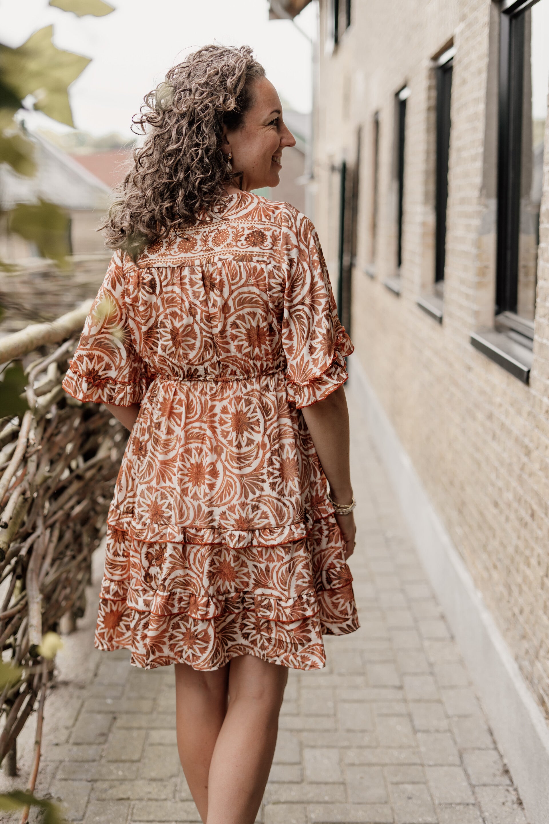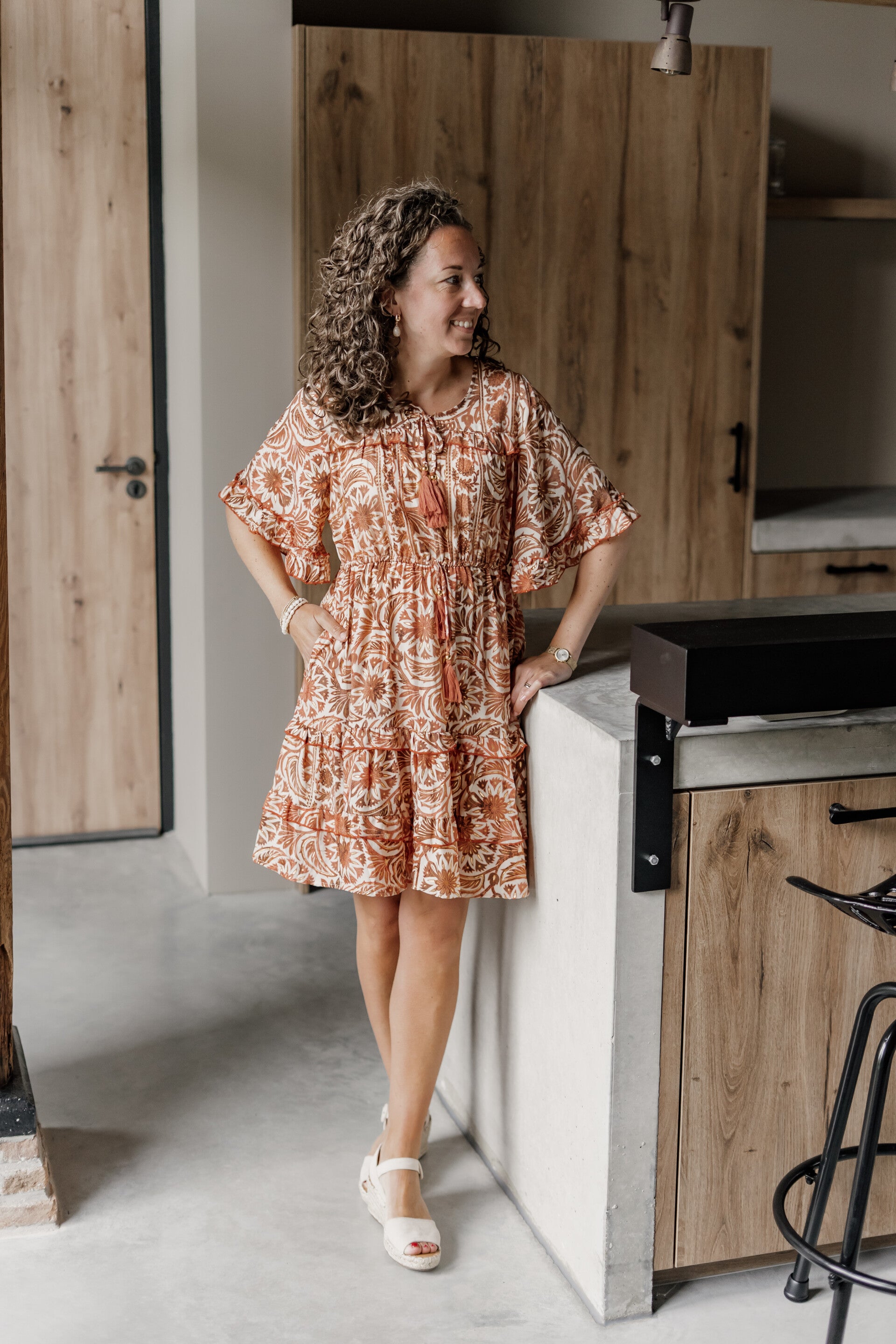 Must-have zomerjurkje in mooie kleuren: bruin, wit én goudaccenten. De jurk bevat steekzakjes en ruffles aan de mouwen. Lengte van de jurk is 93 cm.