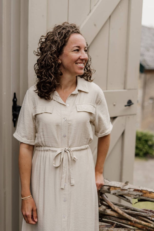 Must-have lange jurk met strikceintuur. De jurk bevat knoopjes tot onder en steekzakjes op de borst.