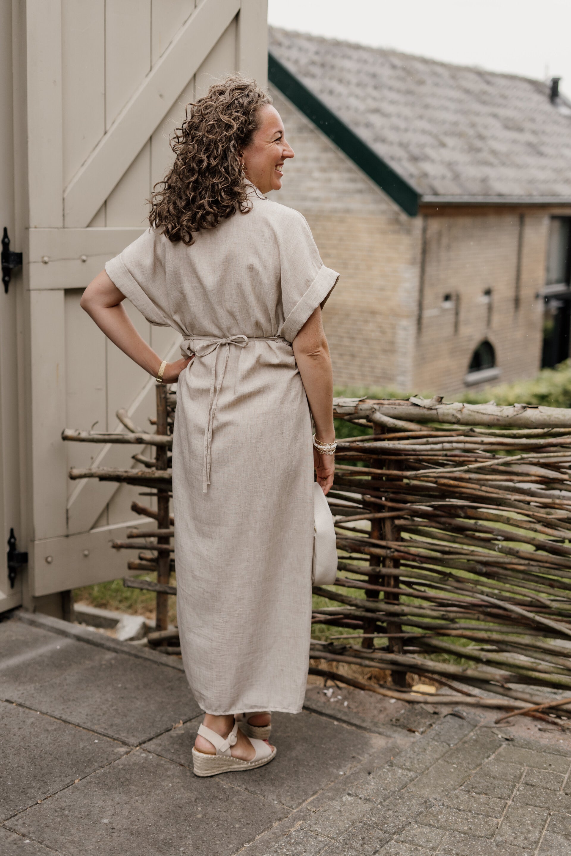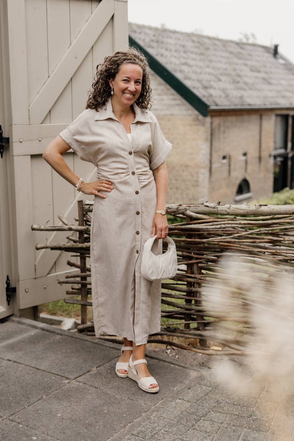 Midi jurk met houten knoopjes aan de voorkant, kraagje aan de bovenkant en strikceintuur aan de achterkant.