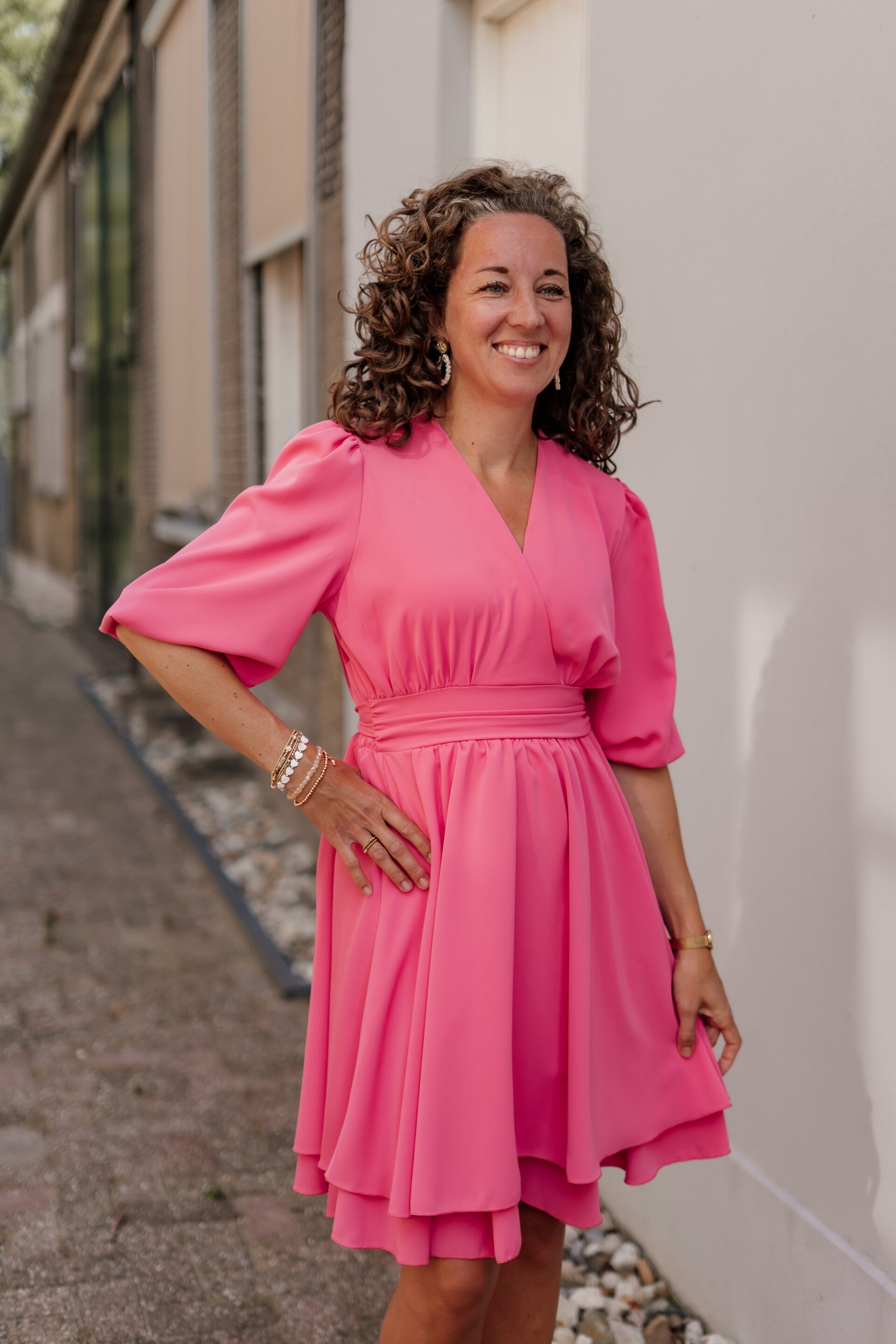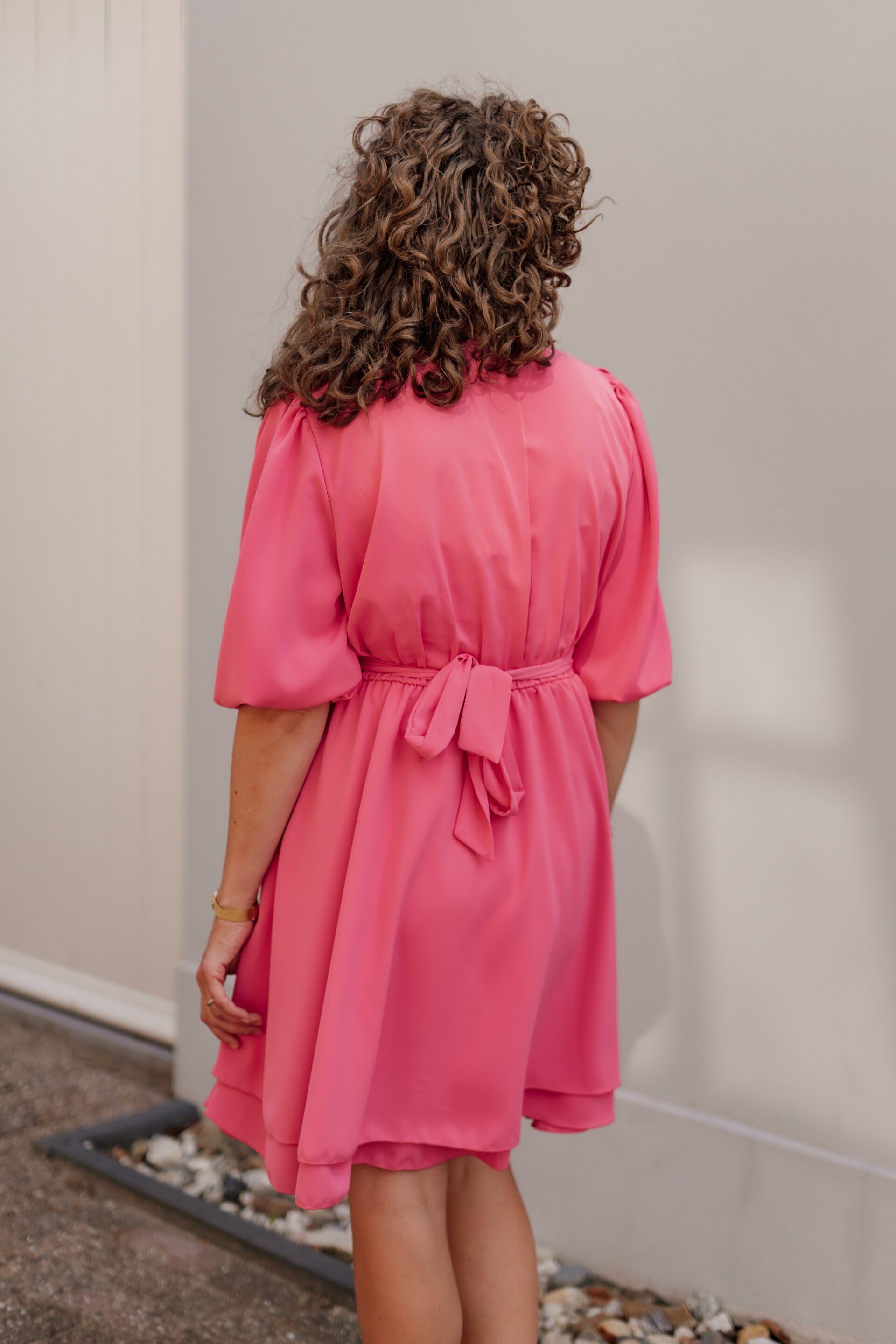 Prachtige jurk gemaakt van travelstof. De jurk bevat twee lagen stof en elegante pofmouwen met een strik. De strik kan zowel aan de voor- of achterkant gedragen worden.