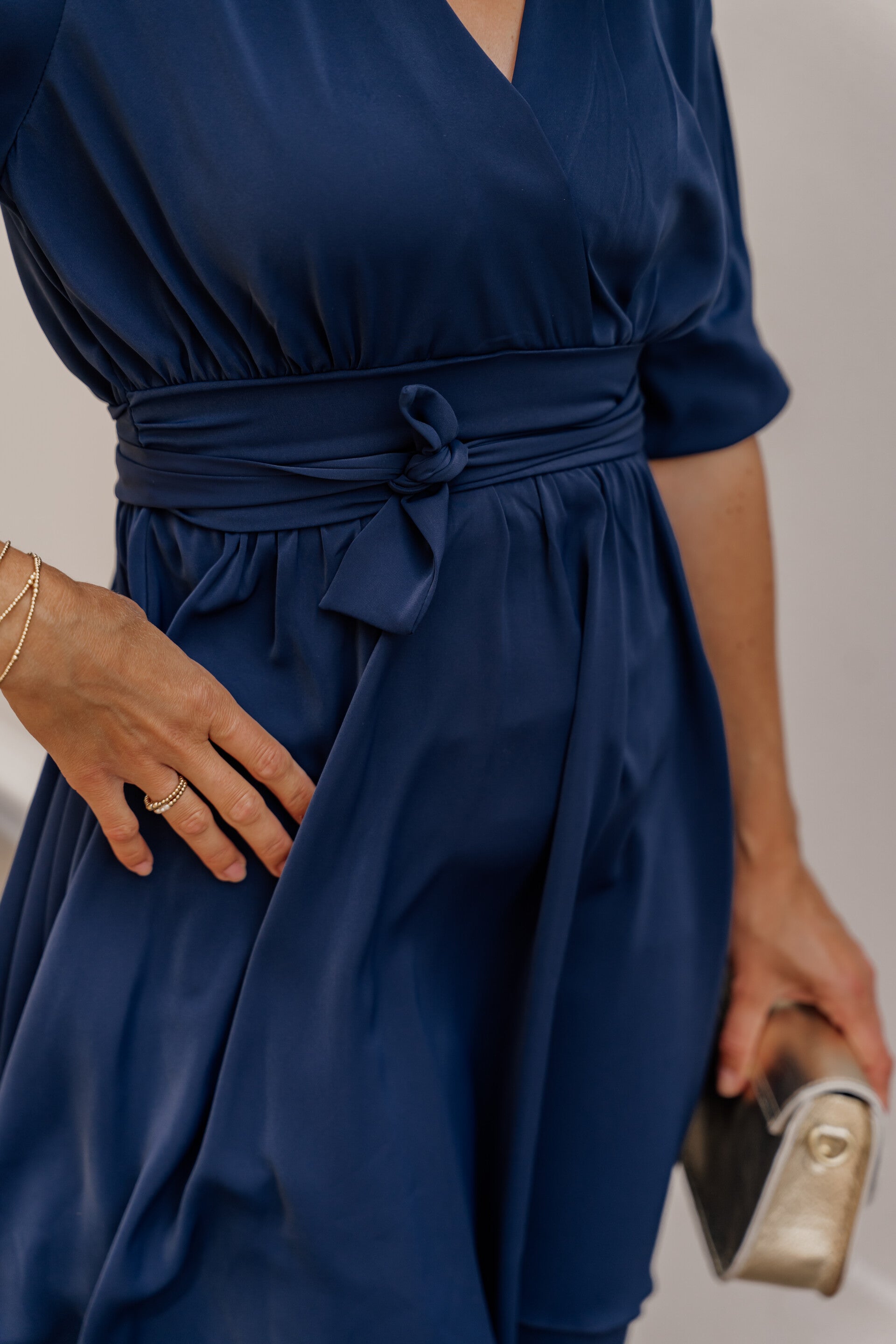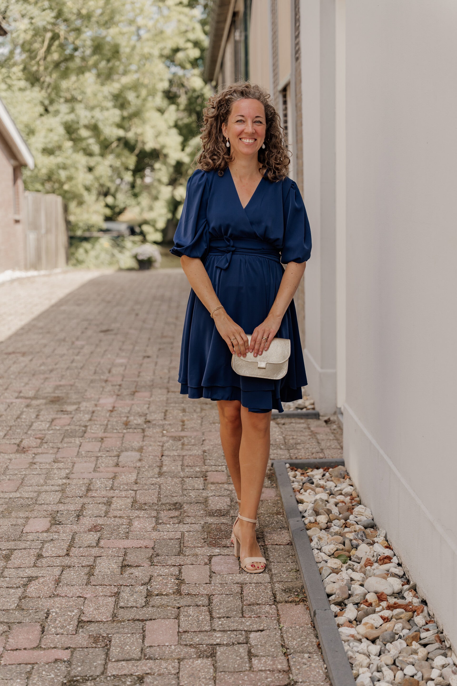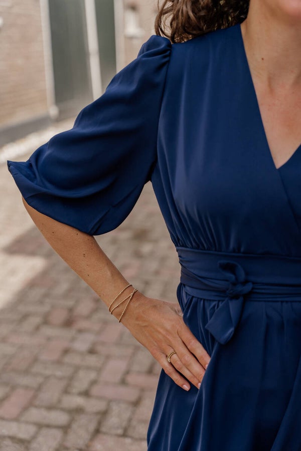 Bestseller jurk nu in een donkerblauwe kleur! Prachtige jurk gemaakt van travelstof. De jurk bevat twee lagen stof en elegante subtiele pofmouwen met een strik. De strik kan zowel aan de voor- of achterkant gedragen worden.