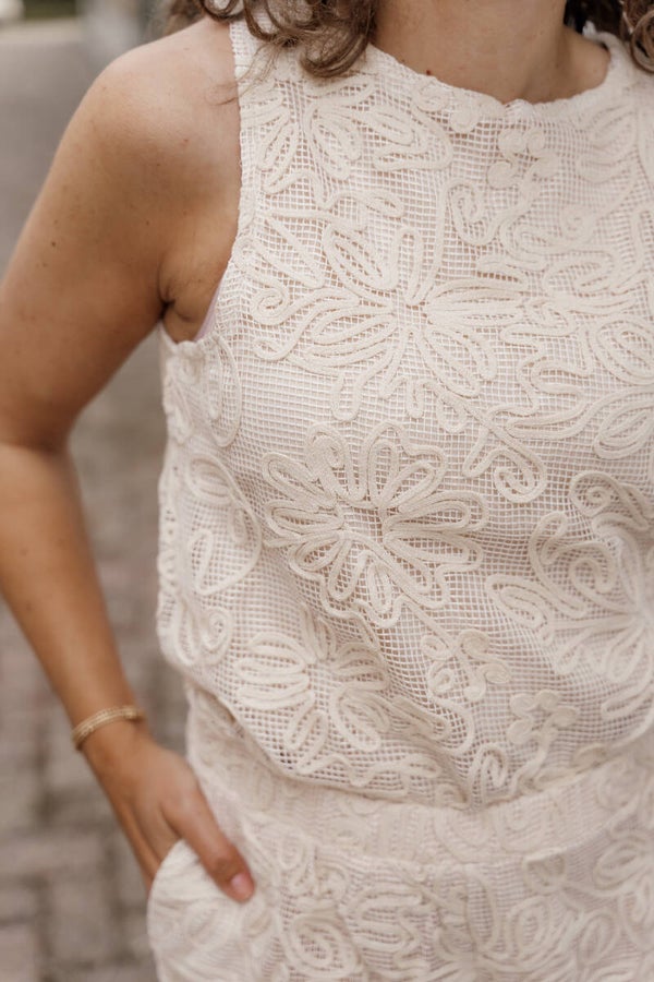 Deze prachtige set bestaat uit een top en een short. Beide items zijn gemaakt van een gehaakt materiaal en hebben een zomerse bohemian vibe. De top is mouwloos en heeft een ronde halslijn met een knoopje in de nek. De short heeft een elastische tailleband en twee steekzakken.
