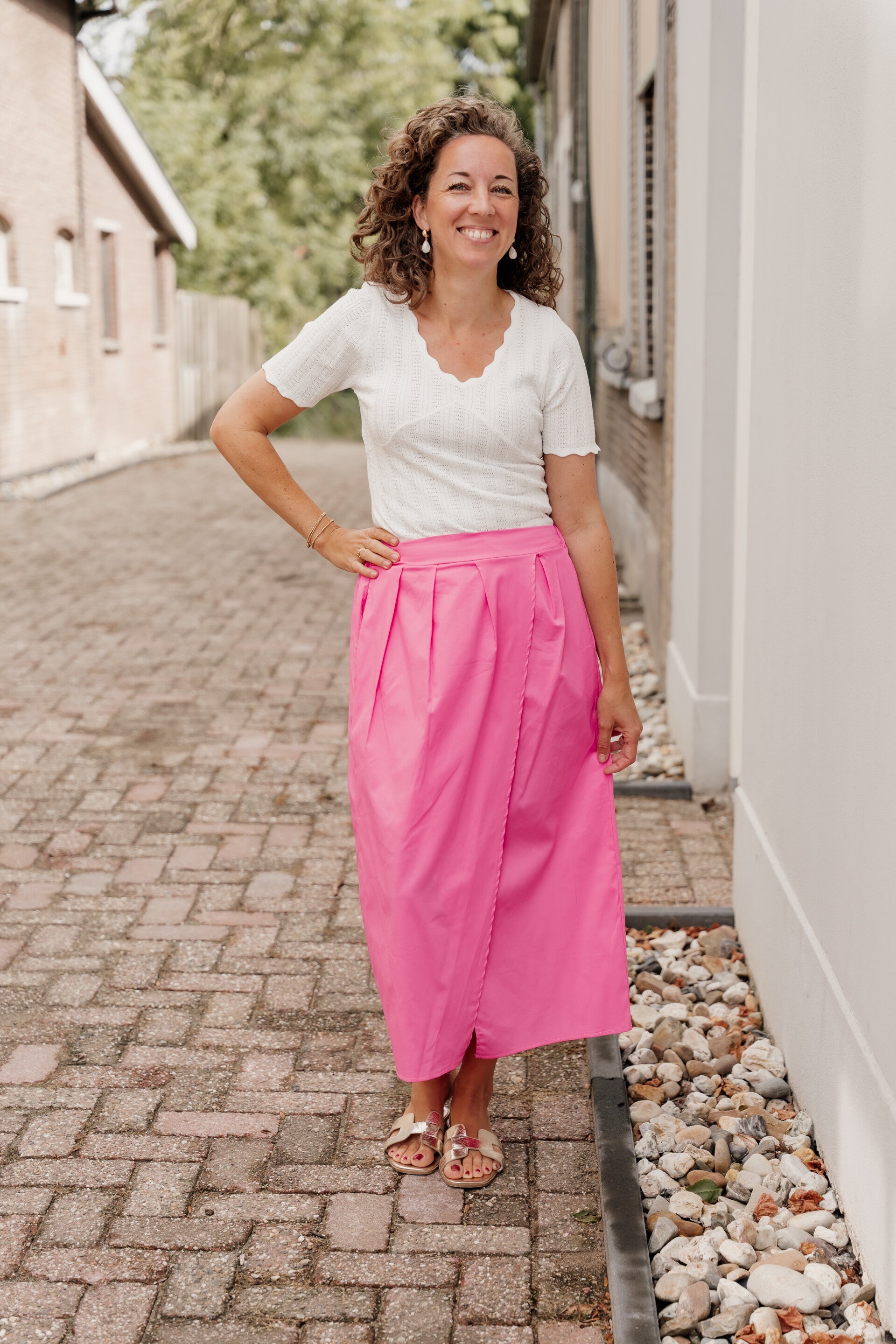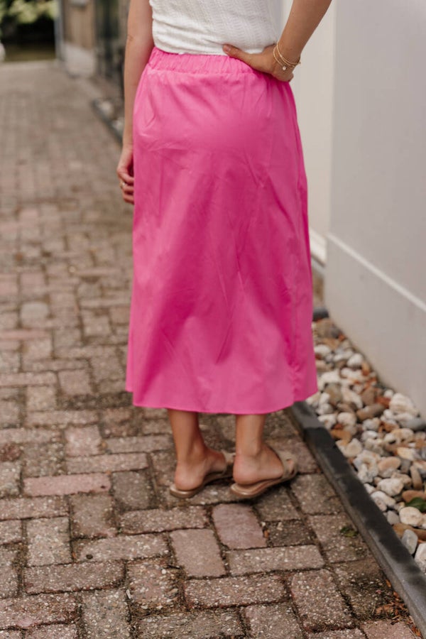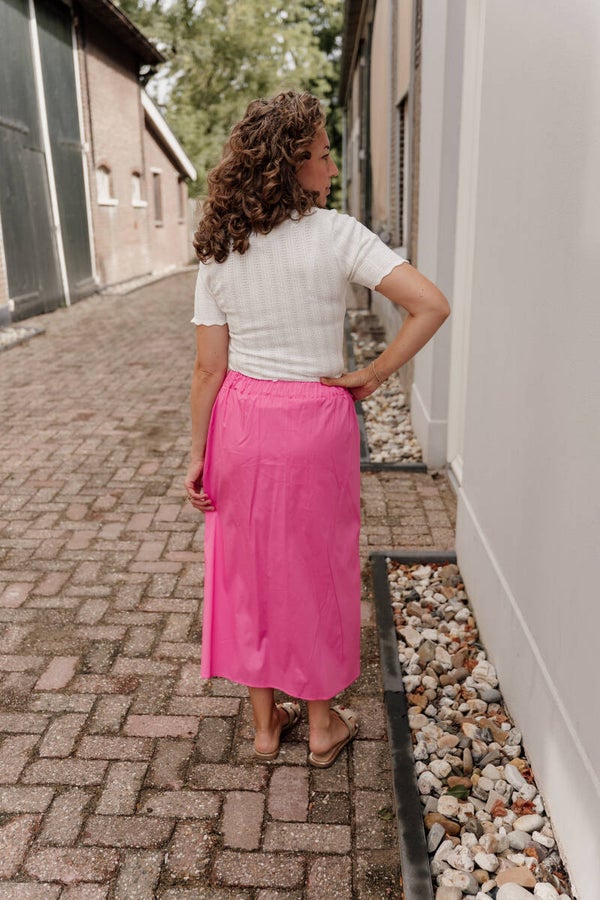 De elastieken tailleband zorgt voor een fijne pasvorm en extra draagcomfort. De rok valt goed op maat en is eenvoudig te combineren met je favoriete top, blouse of gilet met gouden knopen.