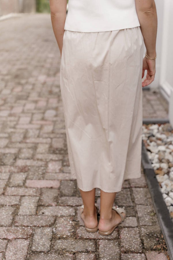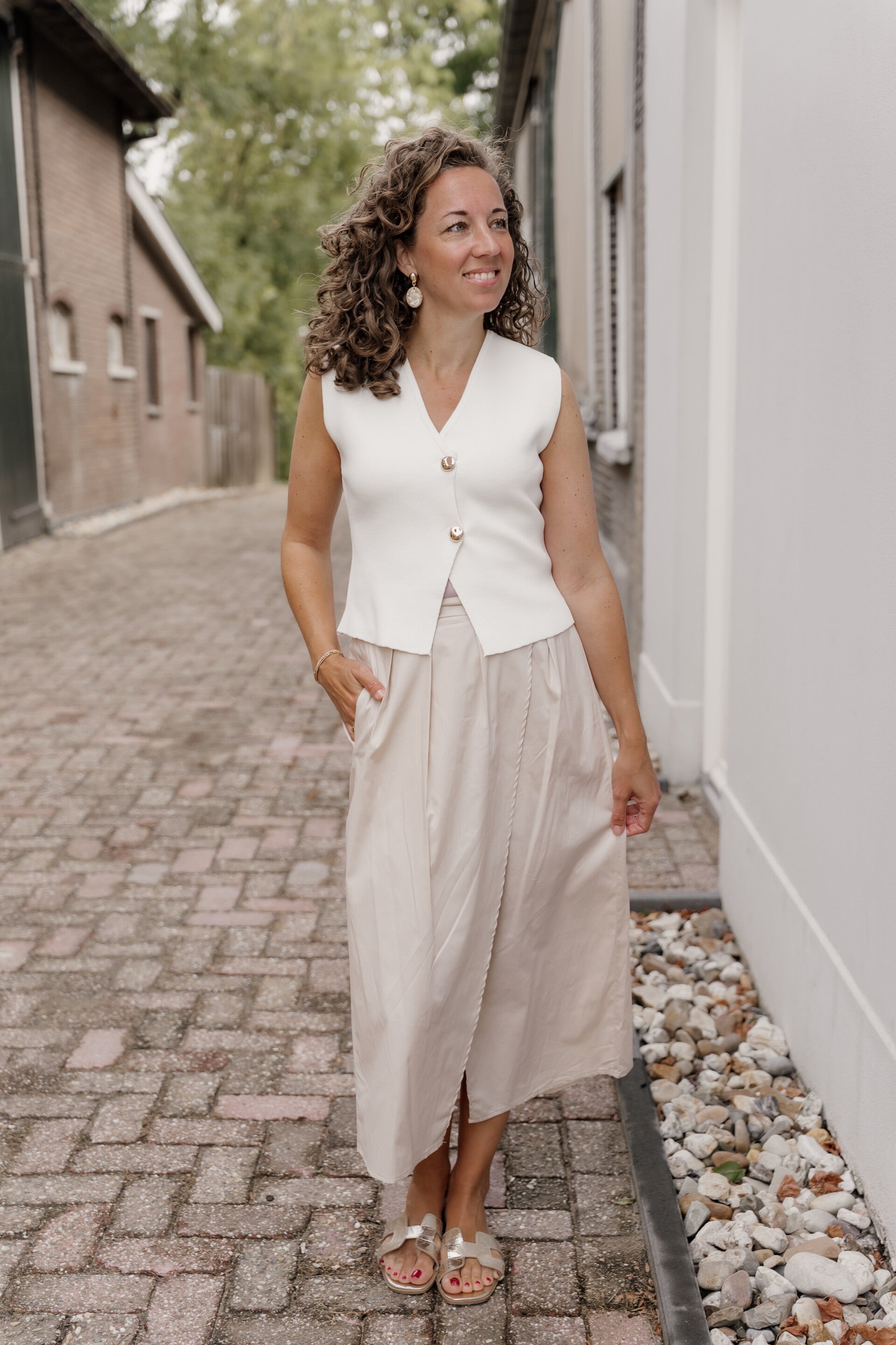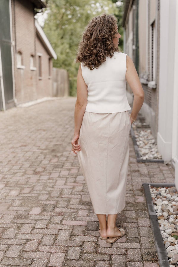 De elastieken tailleband zorgt voor een fijne pasvorm en extra draagcomfort. De rok valt goed op maat en is eenvoudig te combineren met je favoriete top, blouse of gilet met gouden knopen.