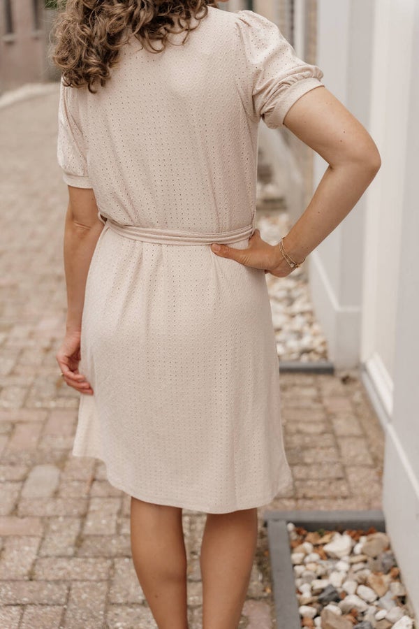 Heerlijk basic jurkje met een mooi werkje in de stof. Het jurk bevat een bijpassend ceintuur en is volledig gevoerd waardoor de stof dikker aanvoelt en niet doorschijnt.