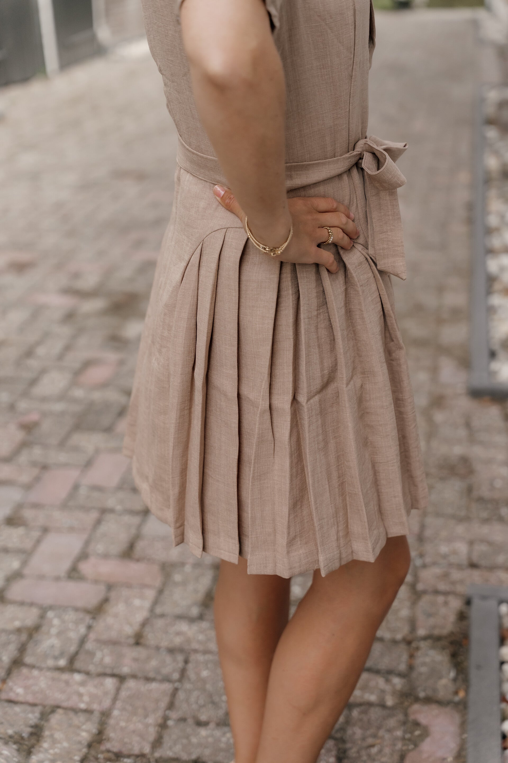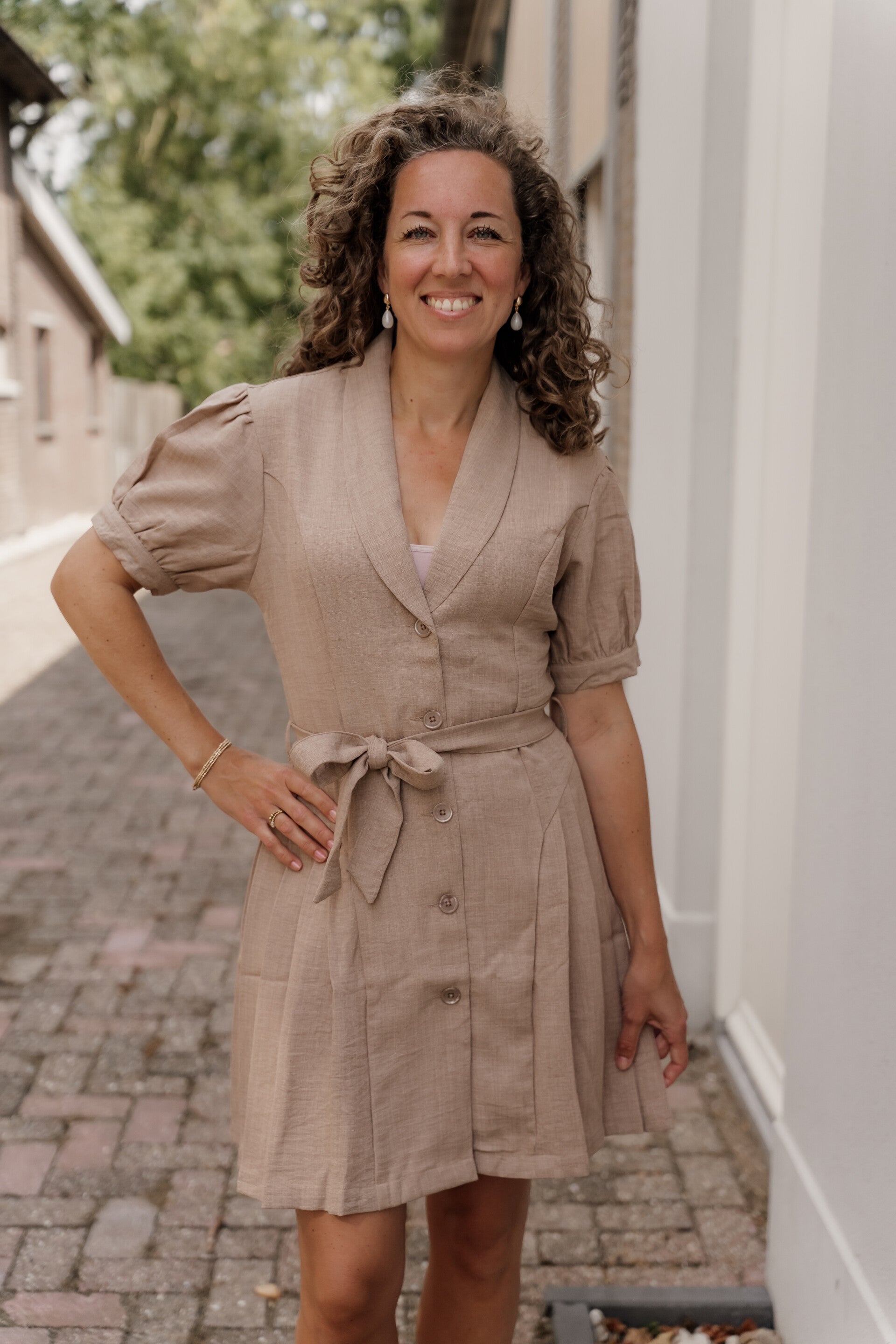 Korte blazer jurk in mooie zandkleur. De jurk bevat knoopjes aan de voorzijde en een strikceintuur. De hals is wat lager uitgesneden waardoor je het beste een hemdje kunt dragen onder de jurk.