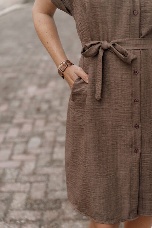 De jurk is verkrijgbaar in 2 nieuwe kleuren: lila en bruin.