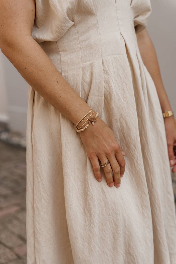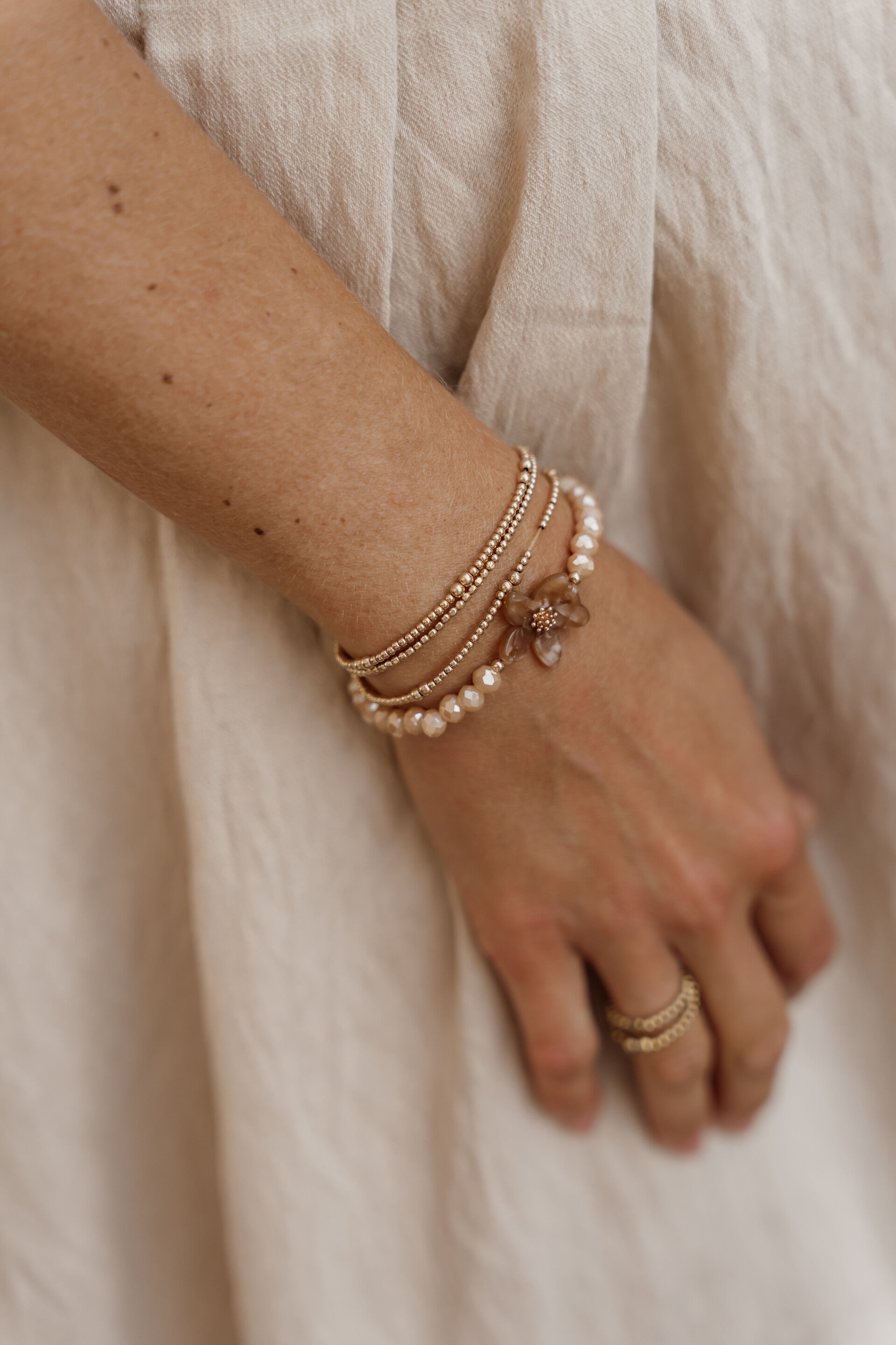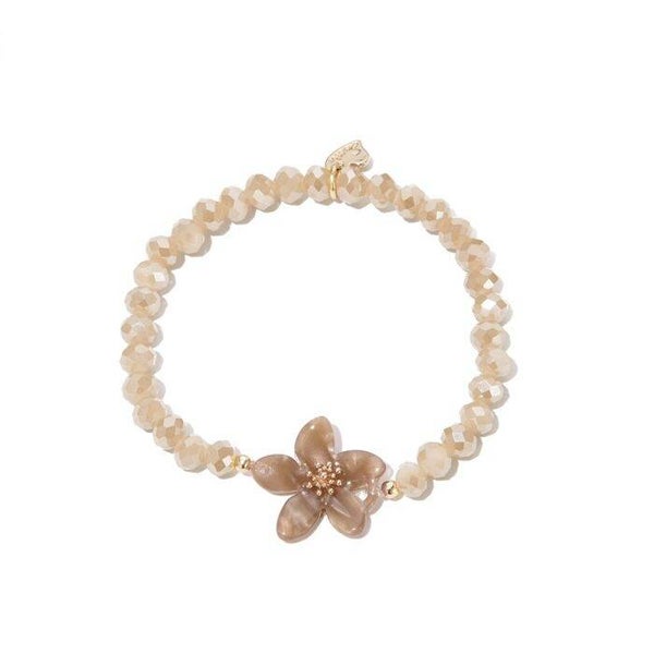 Must-have elastisch armbandje met beige/goud kleurig bloemetje!Combineer dit leuke armbandje met de nieuwe bijpassende oorbellen.Materiaal: nickel vrij