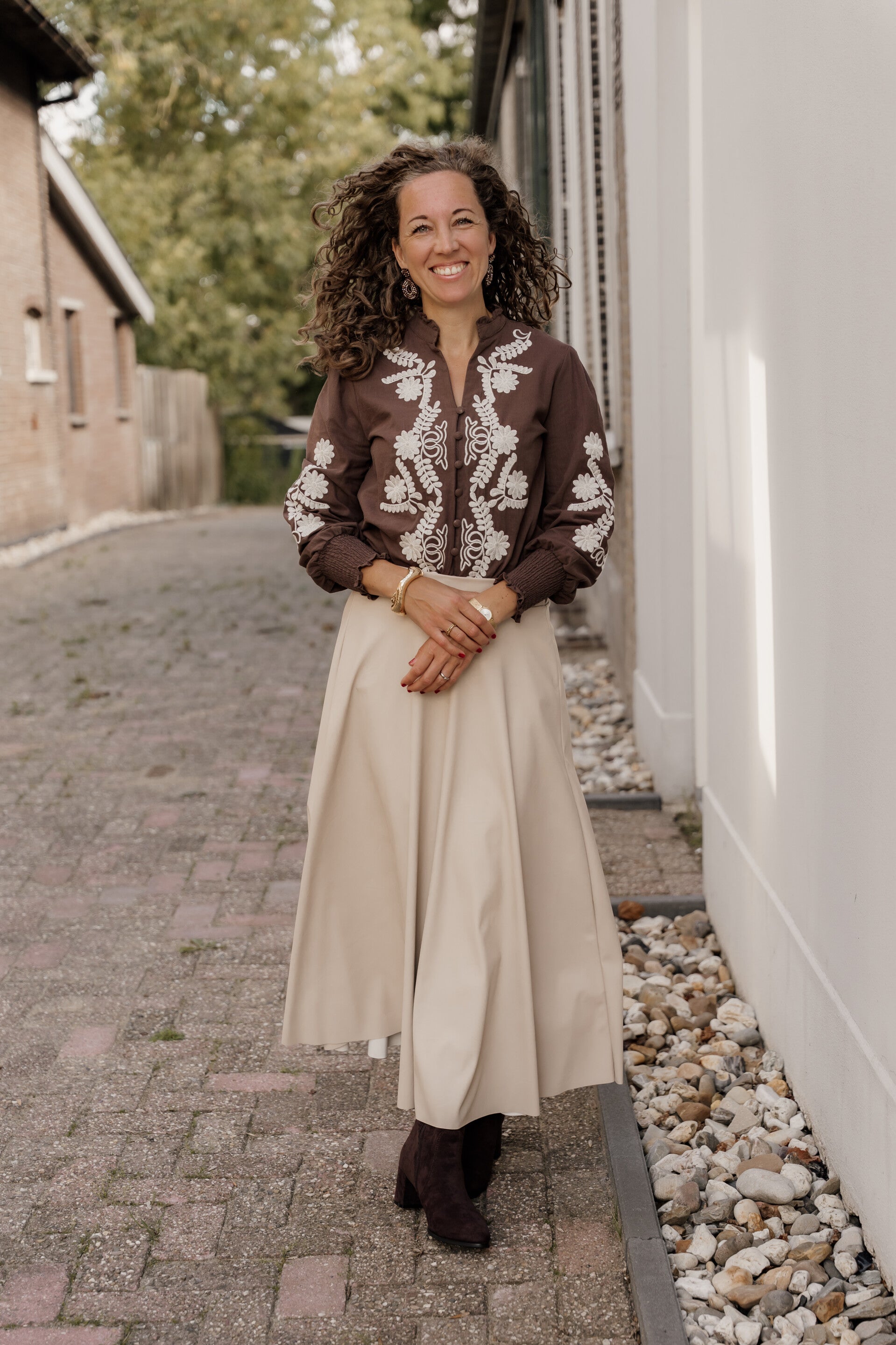 Deze bruine blouse met prachtige beige borduursels is een echte blikvanger. De combinatie van de rijke kleur en de sierlijke bloemdetails geven de blouse een bohemian en elegante uitstraling. De knoopsluiting aan de voorkant en de licht gepofte mouwen met gesmokte manchetten zorgen voor een comfortabele pasvorm en een stijlvolle look.