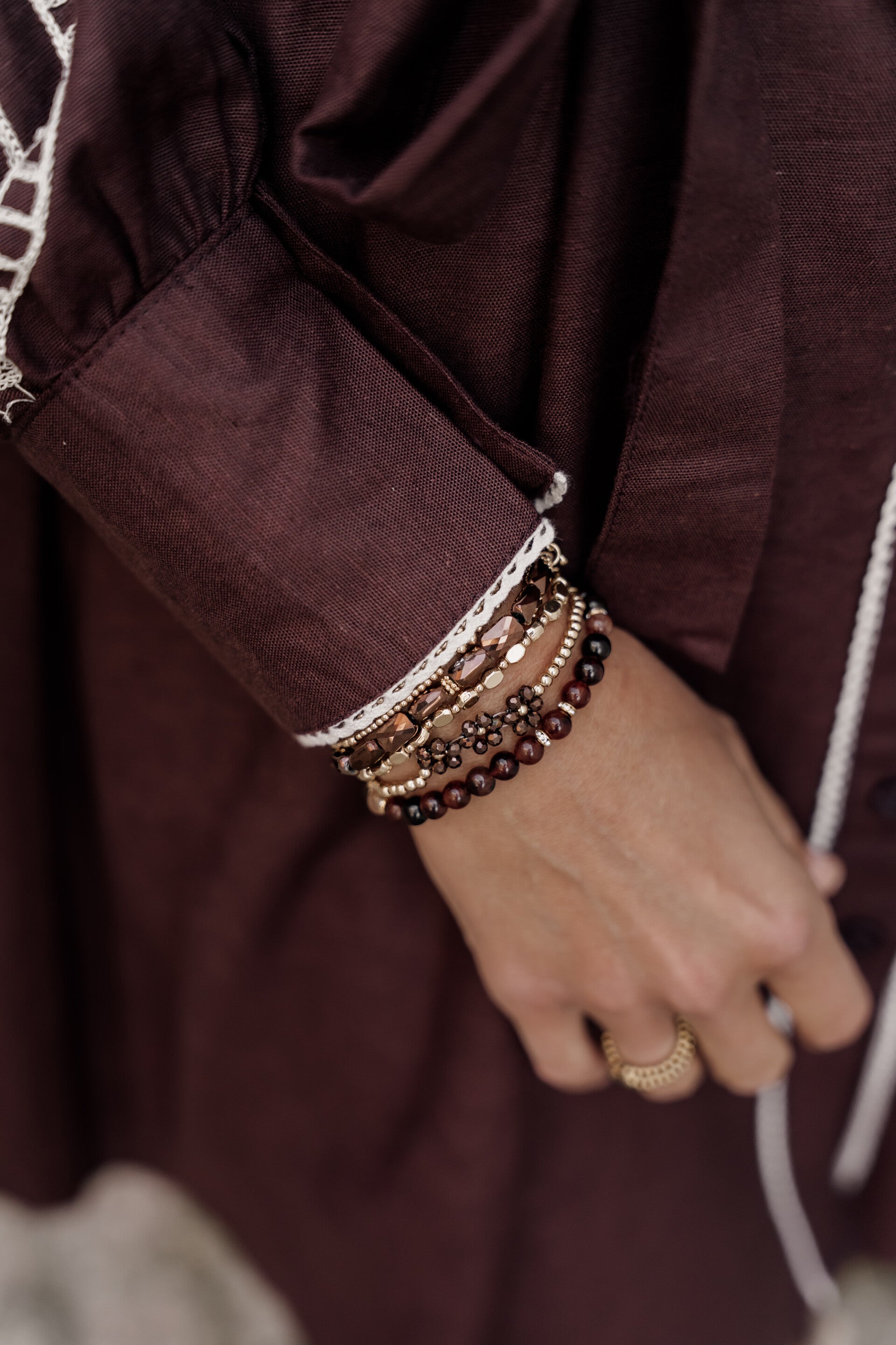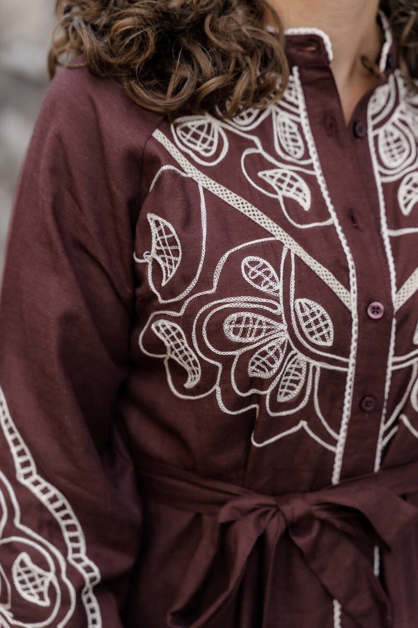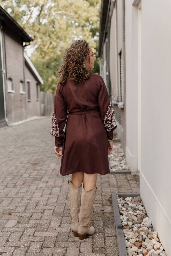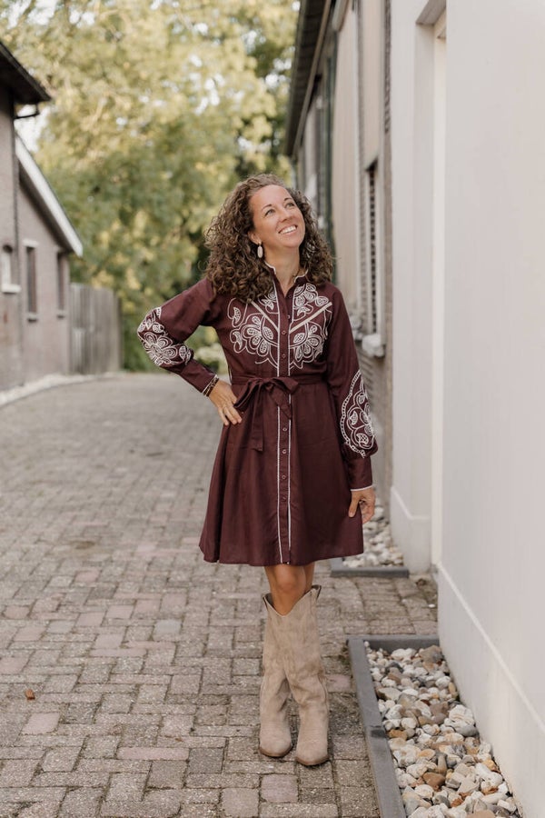 Deze bruine broderie jurk is elegant uitgevoerd met verfijnde beige details die een subtiel contrast geven. Dankzij de volledige knoopsluiting en het bijpassende ceintuur kun je de jurk mooi tailleren naar wens. De zachte katoenkwaliteit en comfortabele pasvorm maken dit een ideale keuze voor zowel een dagje uit als een casual avondlook. Een tijdloze jurk met een warme, natuurlijke uitstraling.