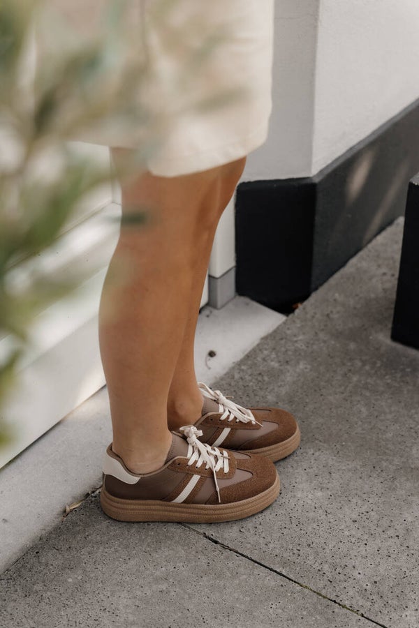 Deze trendy bruin met beige sneakers geven elke outfit een trendy touch. Perfect onder een jurk of rok voor een trendy en sportieve look.