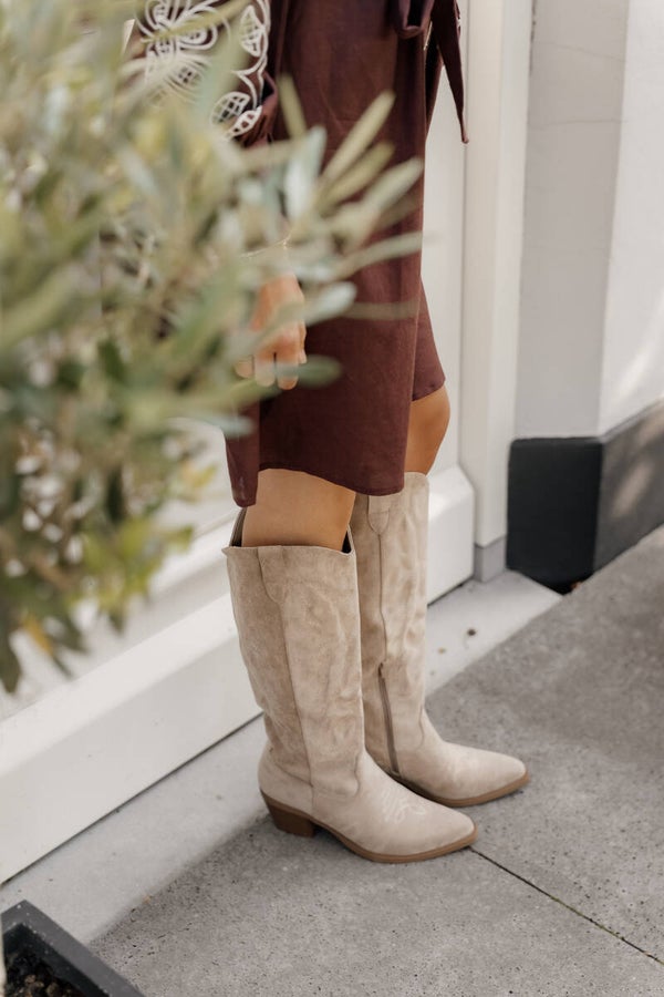 Dé trend van dit seizoen: stijlvolle cowboylaarzen in een neutrale tint die je eindeloos kunt combineren. Het zachte suède en de subtiele details geven de laars een luxe uitstraling. De lengte net onder de knie maakt deze perfect voor zowel jurken als rokken.