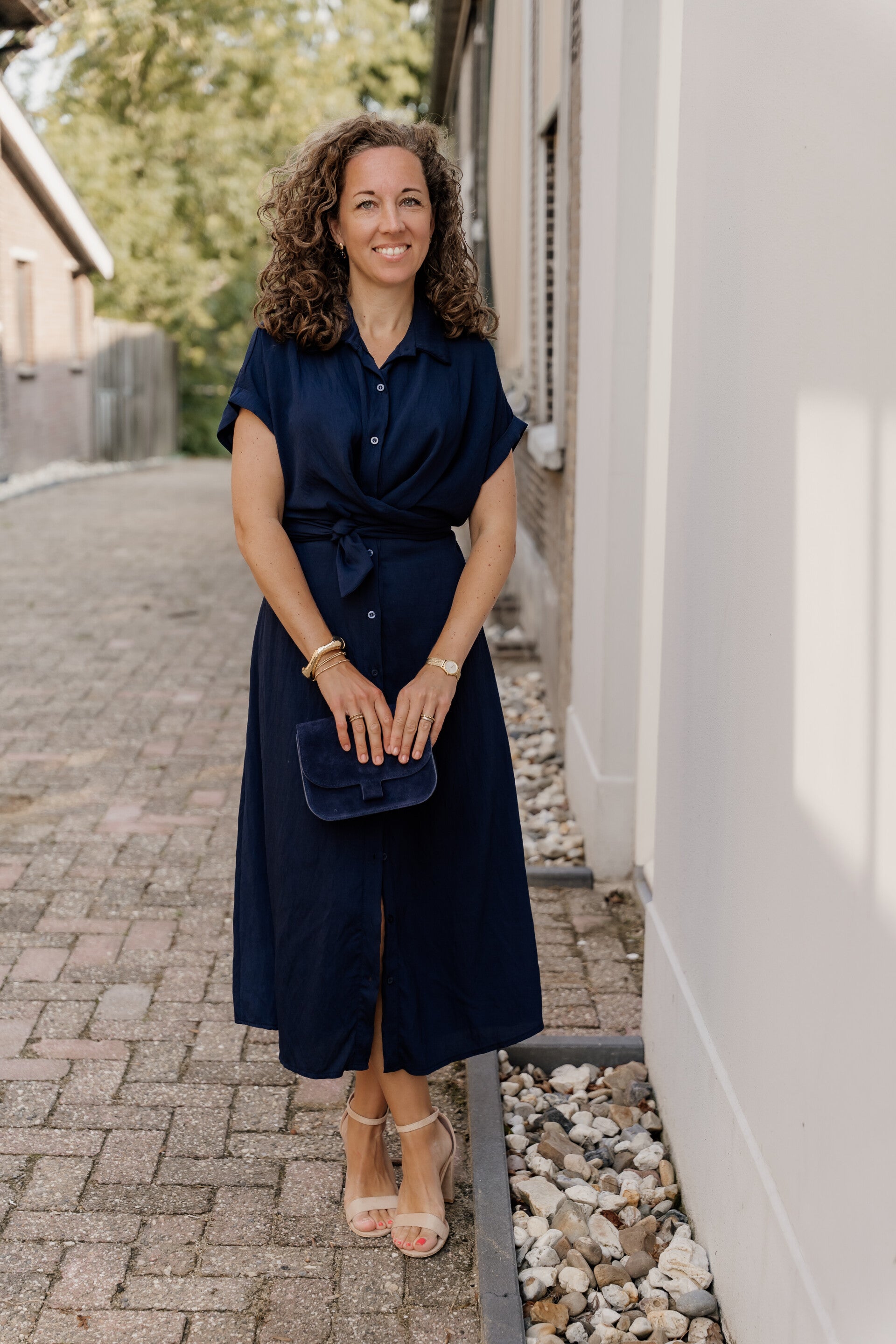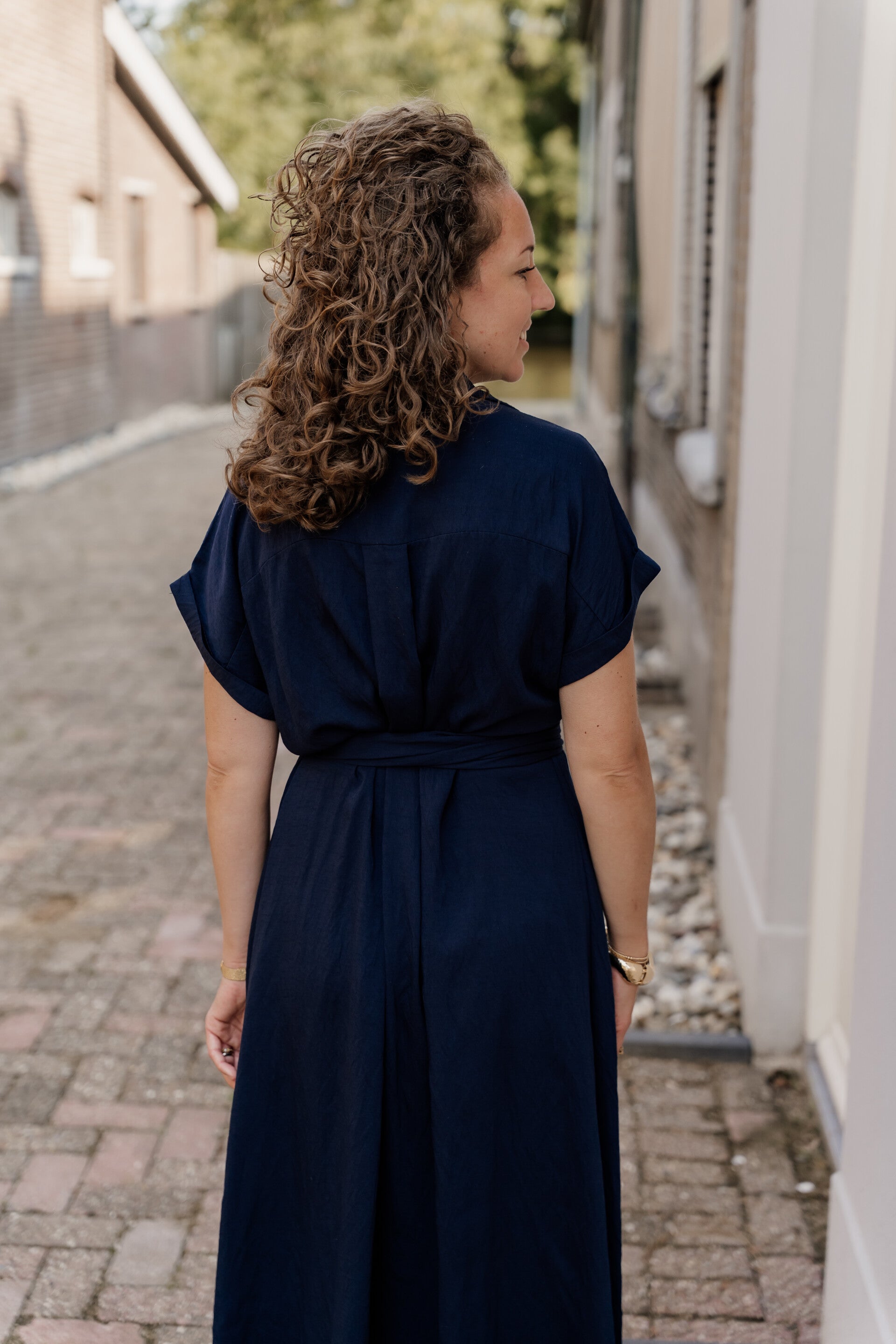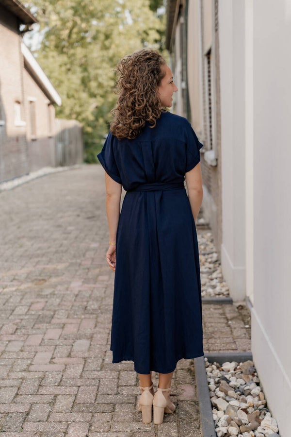 Deze lange donkerblauwe jurk heeft een verfijnde uitstraling en is zowel casual als chique perfect te dragen. De jurk bevat een strikceintuur en knoopjes aan de voorkant.