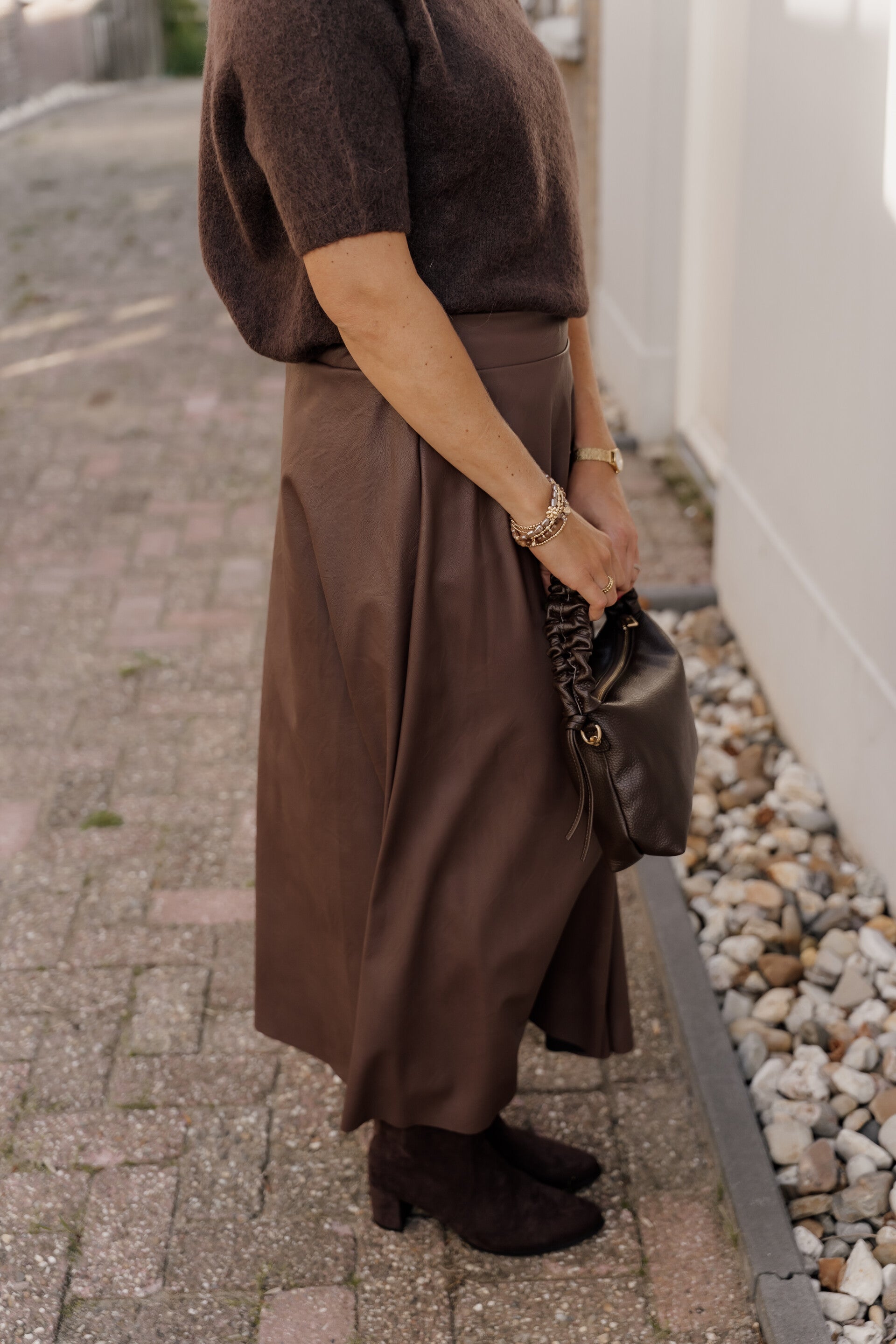 Must-have faux lederen rok in dé trendkleur donkerbruin. De rok bevat een een elastische band aan de achterkant en valt goed op maat.