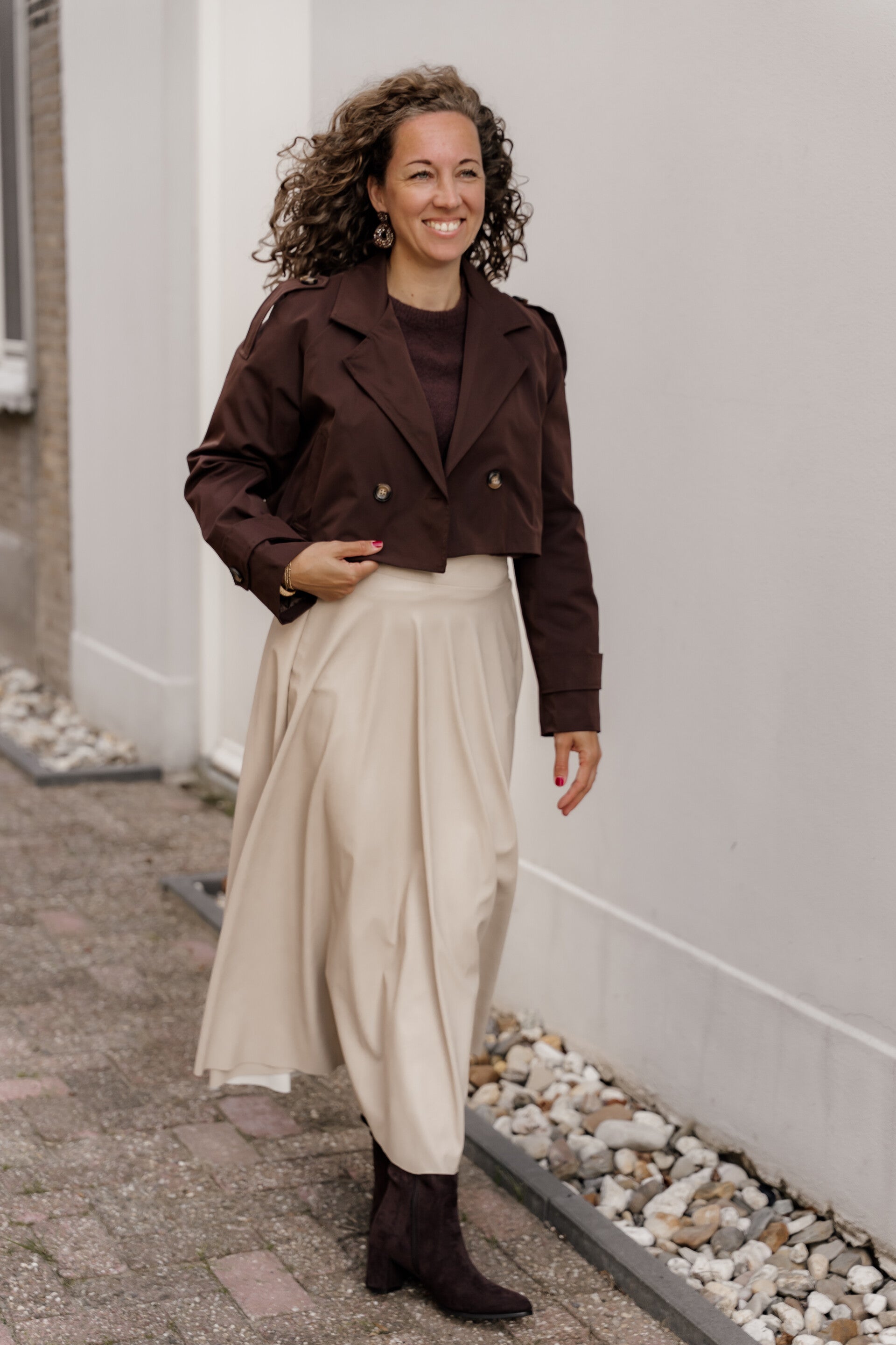 Een tijdloos klassiek jasje in een moderne variant: deze korte trenchcoat is dé jas die elke outfit afmaakt. Dankzij de cropped lengte combineer je hem perfect met een rok of jurk - zo blijft je silhouet mooi zichtbaar.