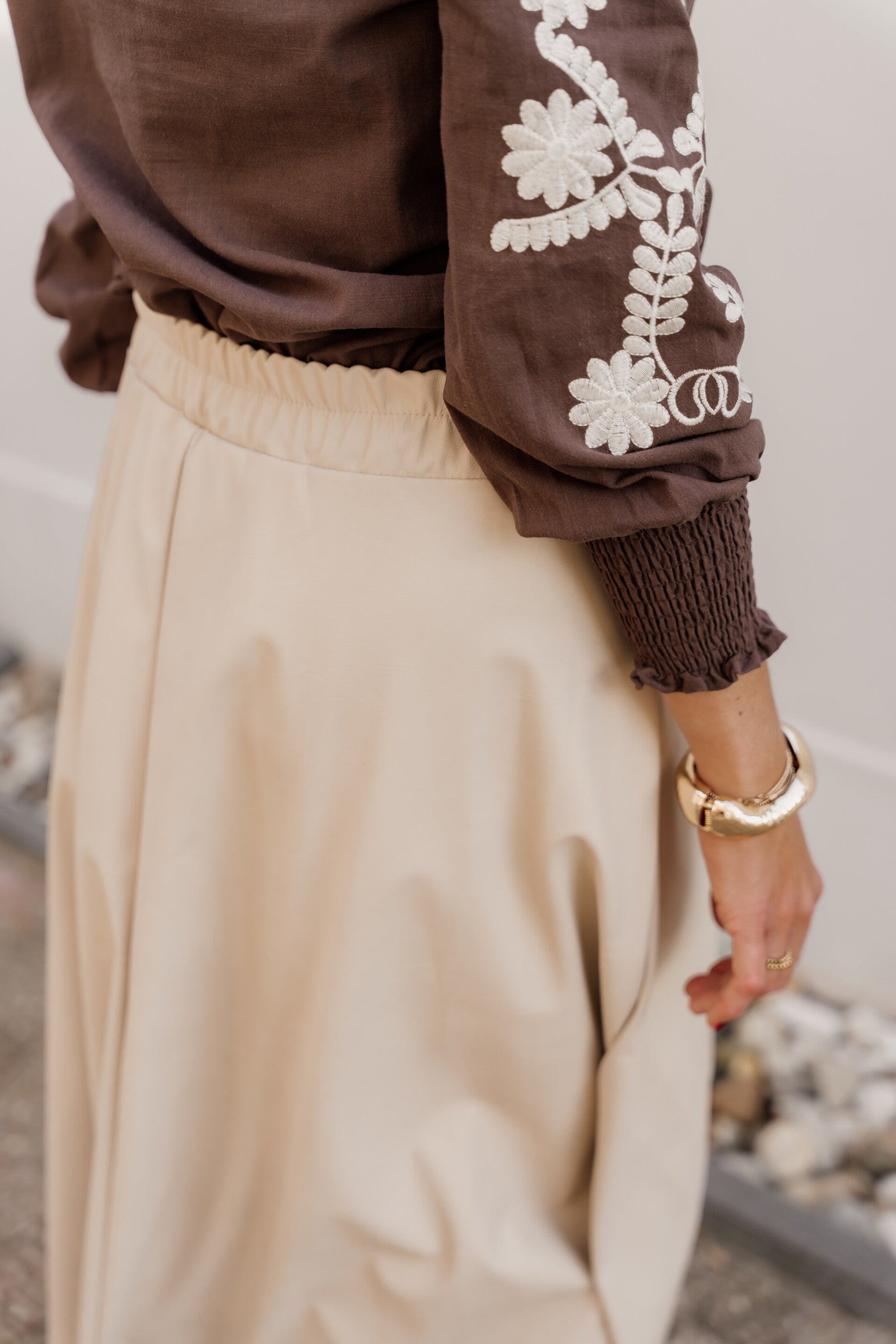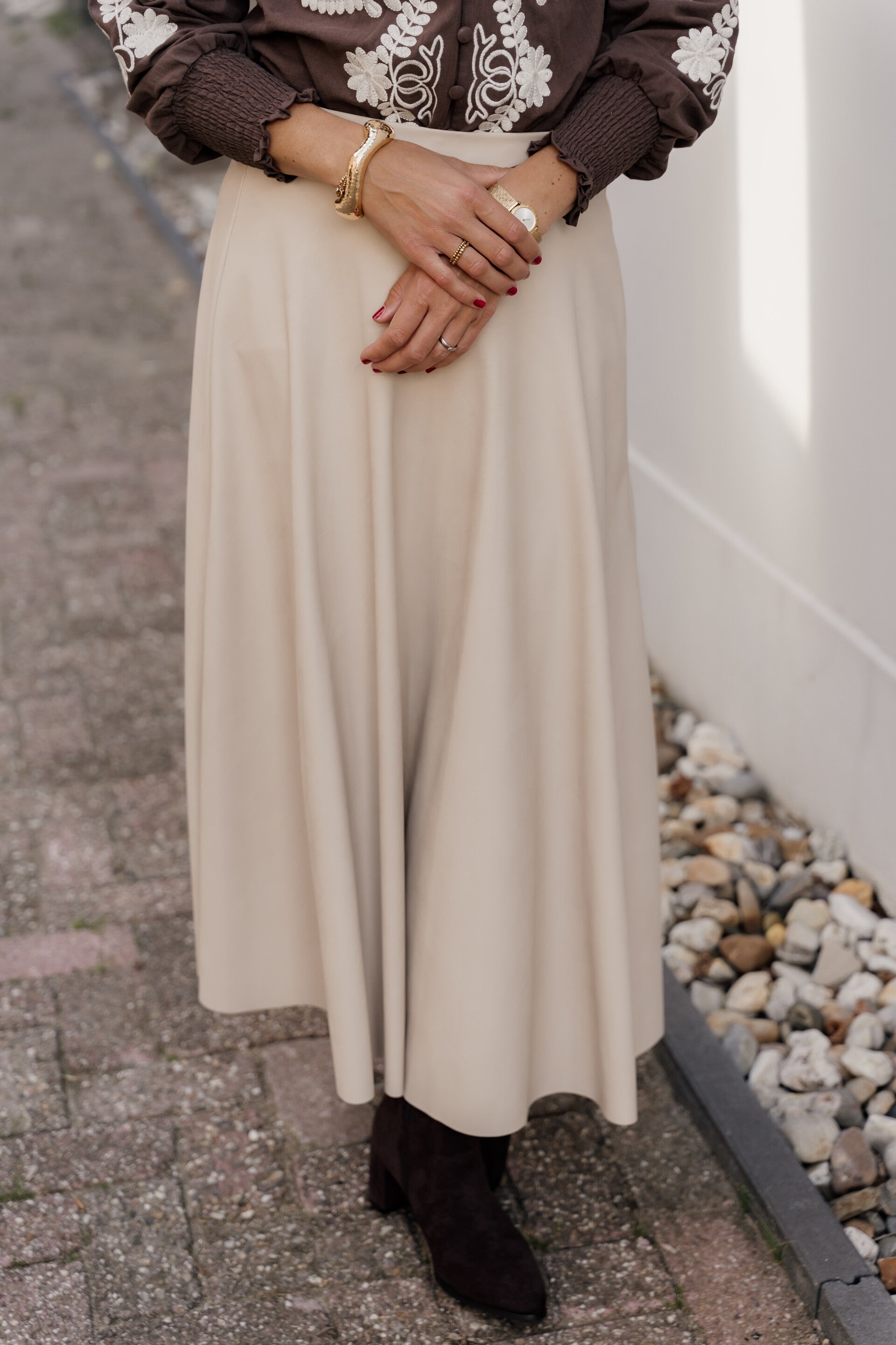 Must-have faux lederen rok in de neutrale kleur beige. De rok bevat een een elastische band aan de achterkant en valt goed op maat.