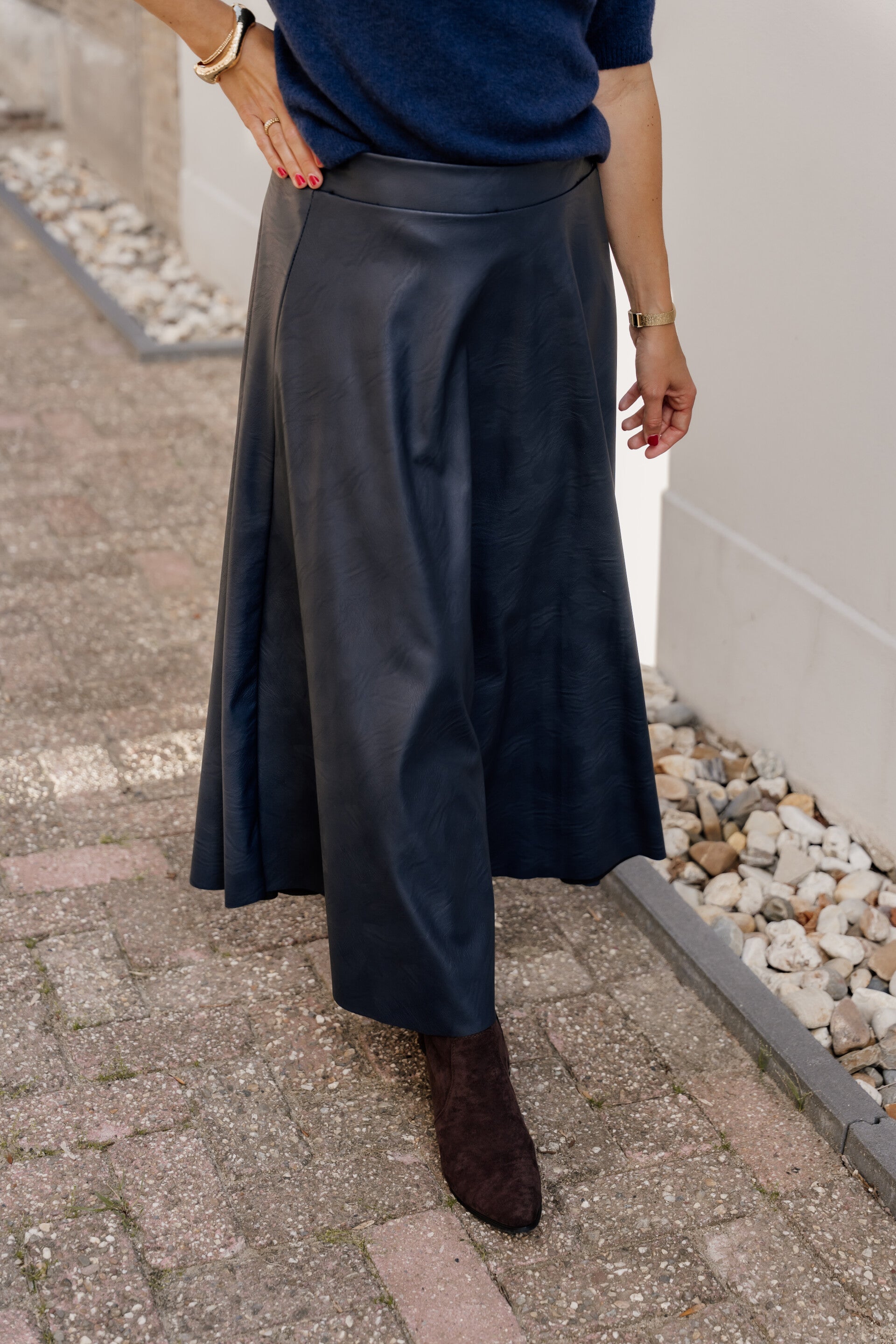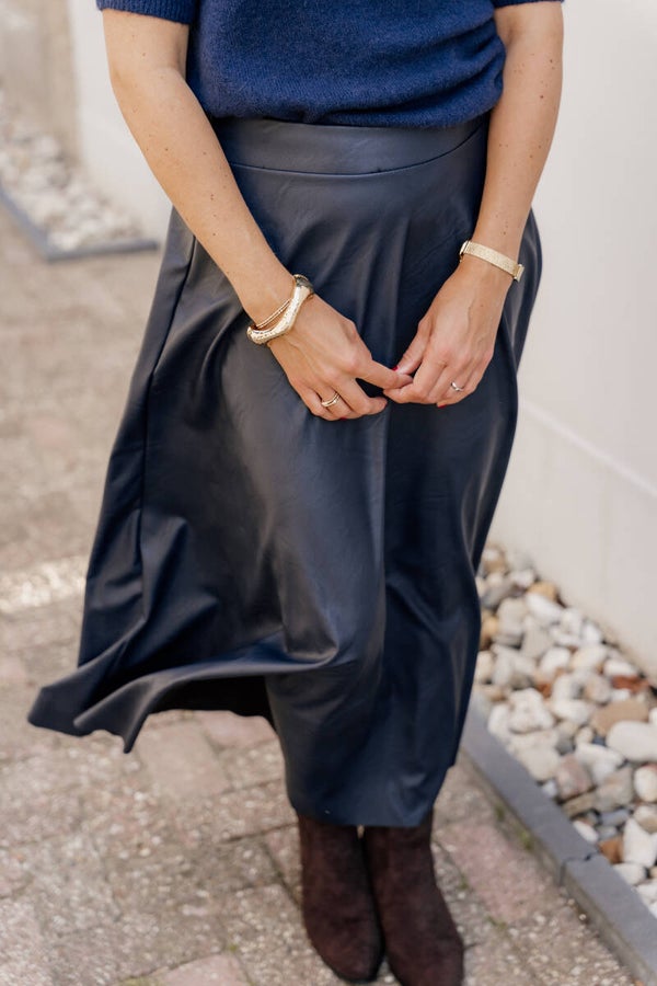 Must-have faux lederen rok in dé trendkleur donkerblauw. De rok bevat een een elastische band aan de achterkant en valt goed op maat.