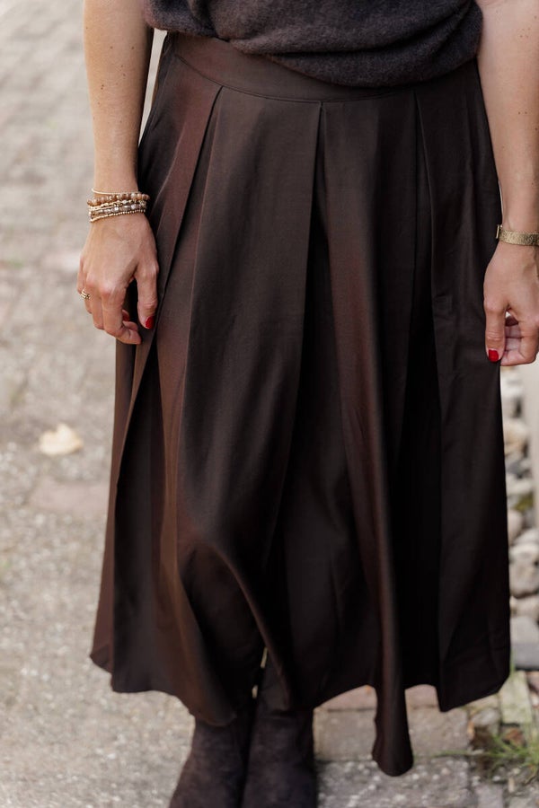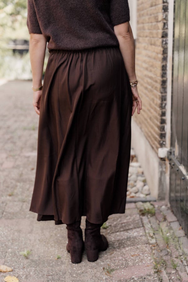 Deze donkerbruine maxi rok is een tijdloos en stijlvol item dat in elke garderobe thuishoort. De soepelvallende stof en de lichte plooien zorgen voor een elegante en vrouwelijke uitstraling, terwijl de comfortabele tailleband ervoor zorgt dat de rok fijn draagt, de hele dag door.