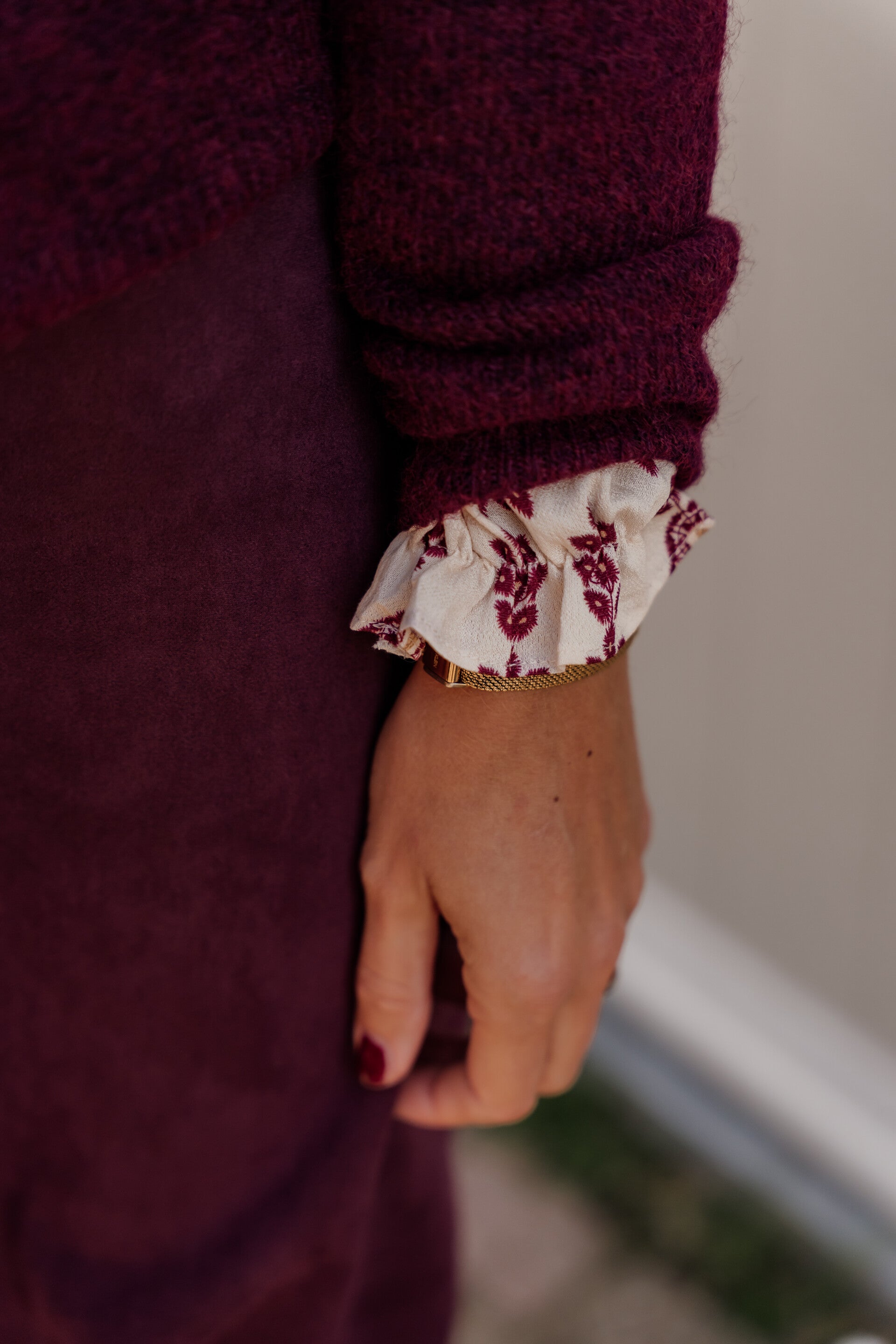 De blouse valt soepel en luchtig, perfect voor zowel een casual als geklede look. Perfect te combineren met ons bordeauxkleurige vestje met gouden knopen én de suèdine rok in bijpassende bordeauxtint - zo creëer je een elegante, vrouwelijke en volledig op elkaar afgestemde outfit.